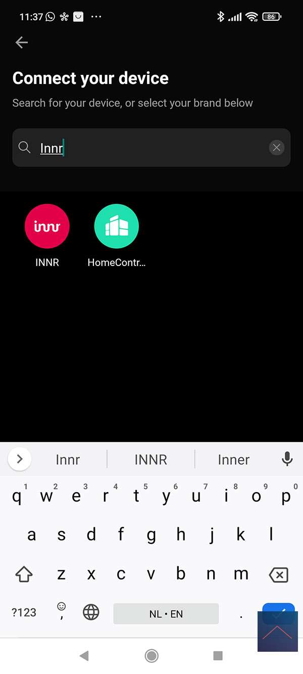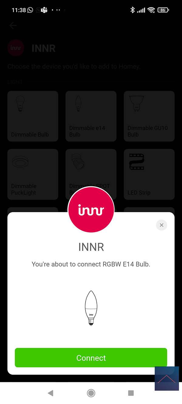 We beginnen met het inloggen in de APP en door naar 'onze apparaten' te gaan. Vervolgens drukken we op het plusje en zoeken de INNR lamp op. Als je deze hebt geselecteerd moet je even scrollen naar beneden je moet namelijk de RGBW e14 Bulb hebben. Als we door drukken dan vraagt de APP om de lamp van stroom te voorzien. De lamp zal van kleur verspringen en 1x knipperen om aan te geven dat hij gevonden is.