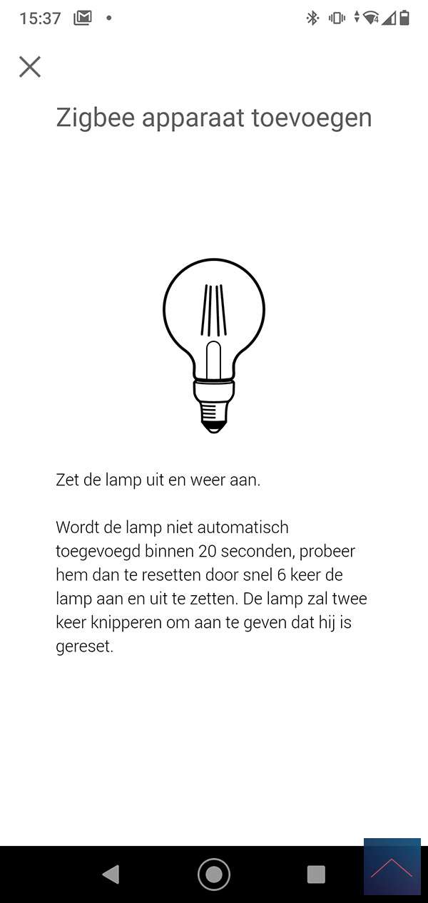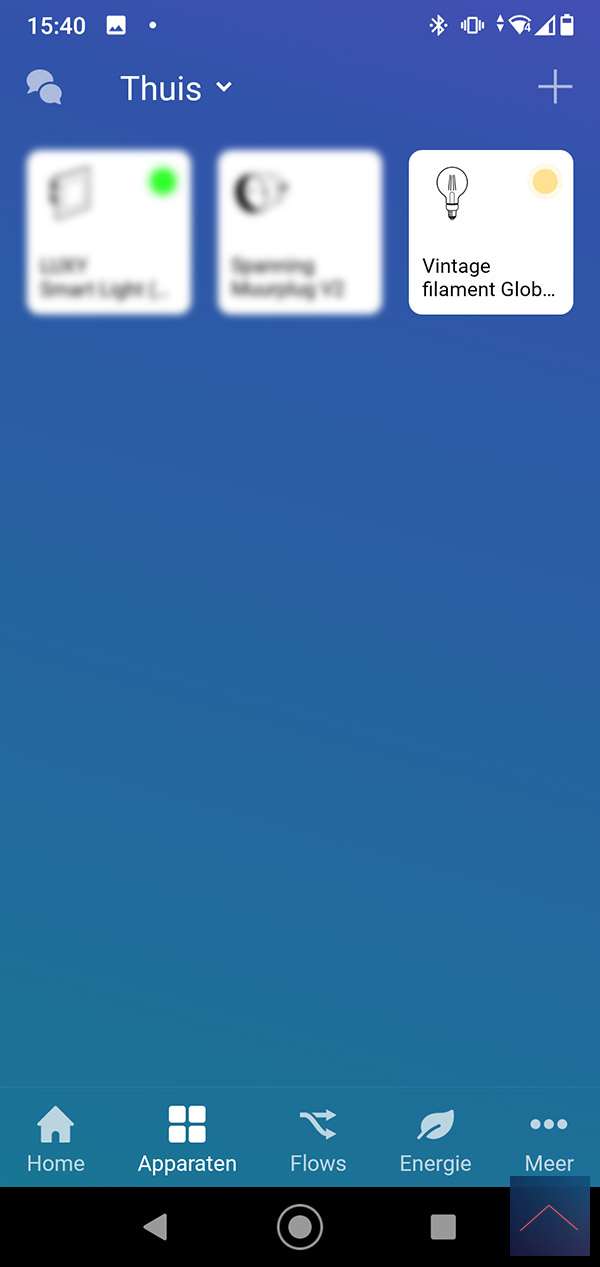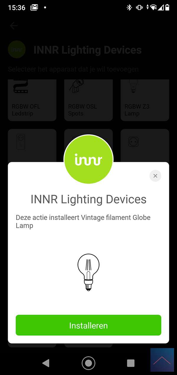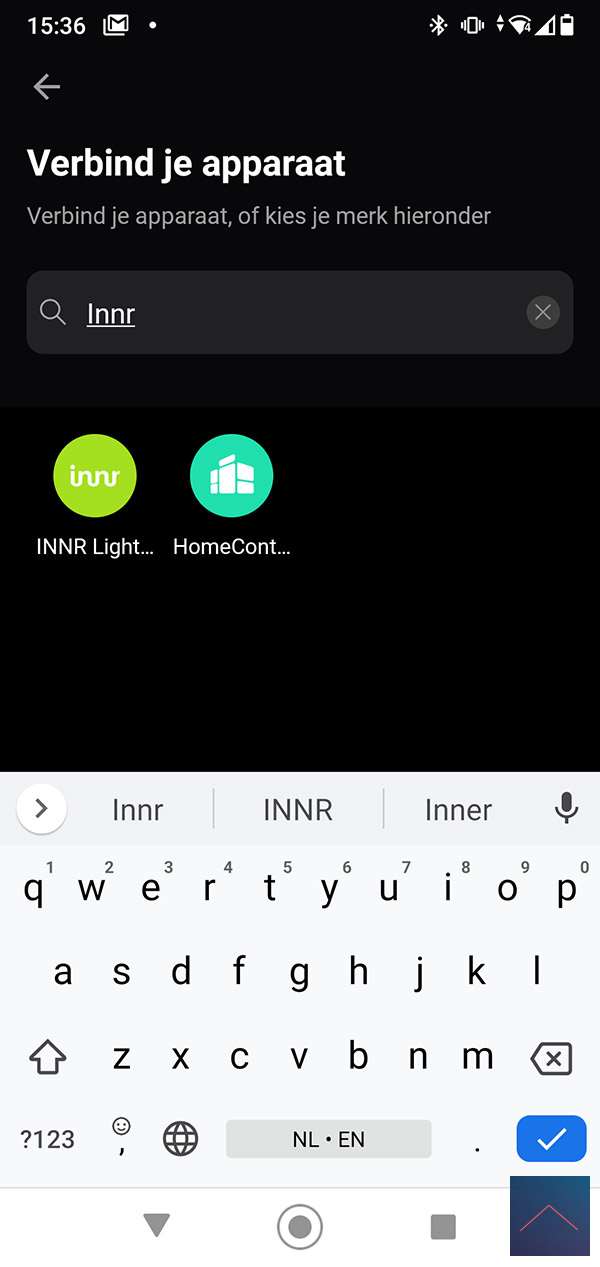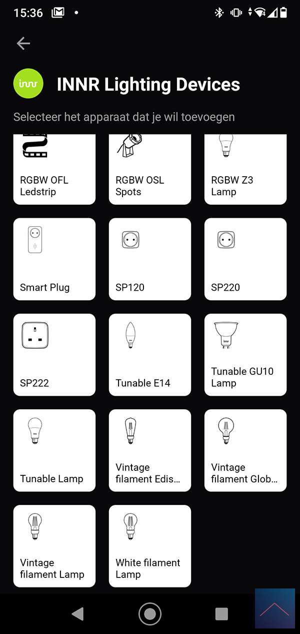 Nu kunnen we de Homey APP opstarten en naar onze apparaten gaan. Druk vervolgens op het plusje en zoek de INNR op. Even goed kijken dat je de juiste versie pakt want er zijn er nogal wat. Er wordt gevraagd om de lamp nogmaals aan en uit te doen. Hierna wordt de lamp direct gevonden en ik zie hem 2x knipperen.