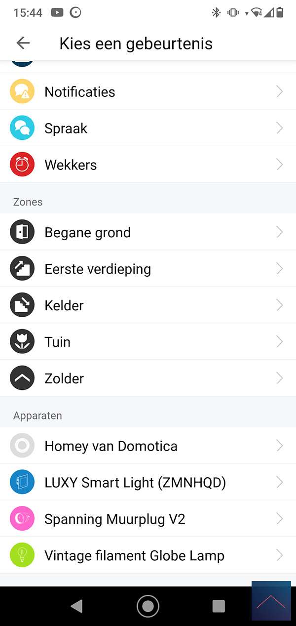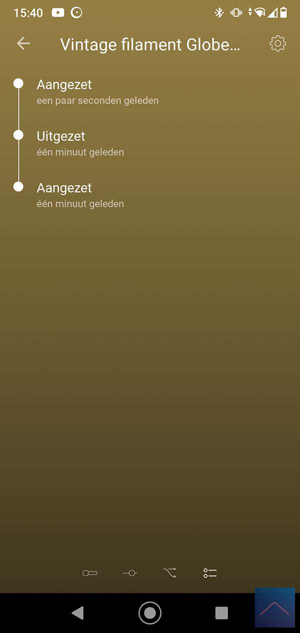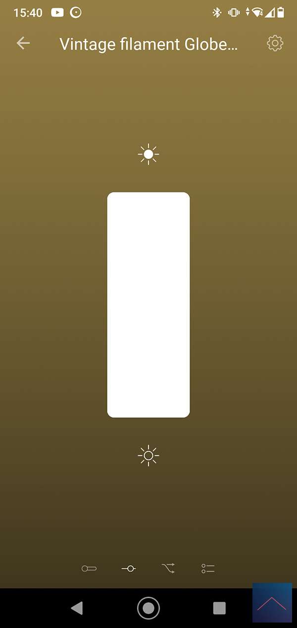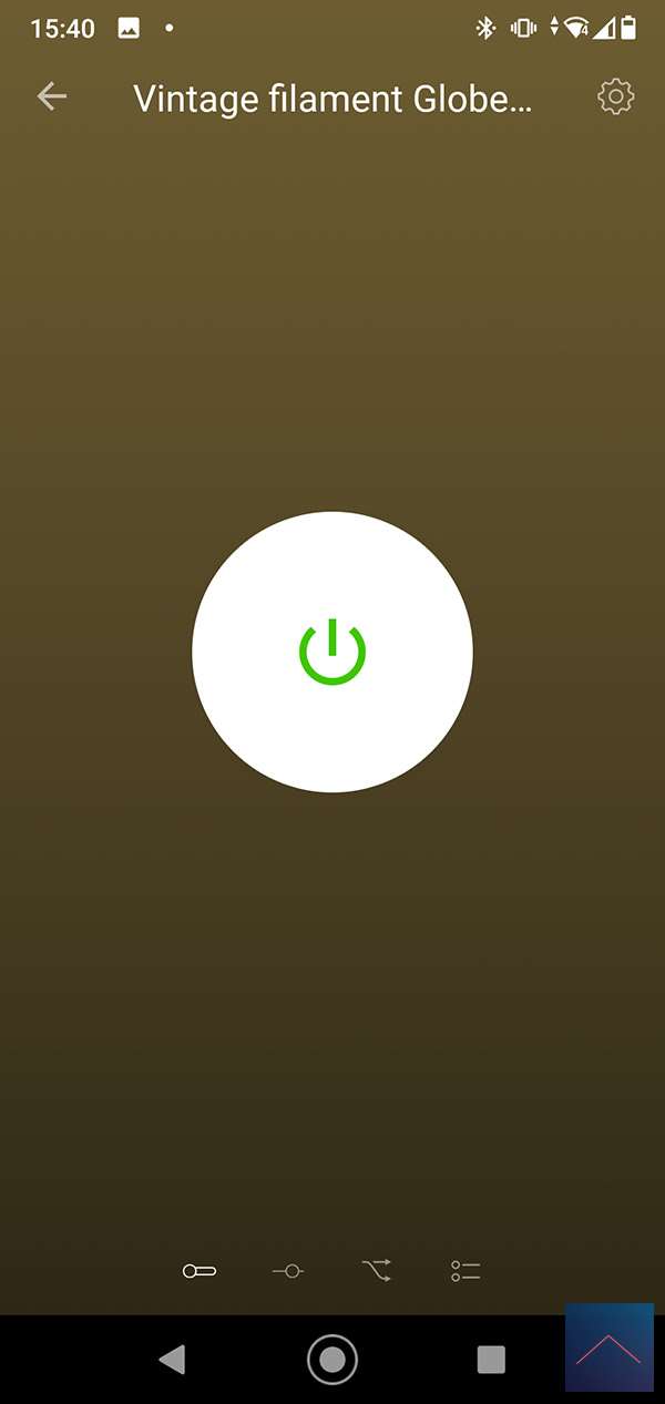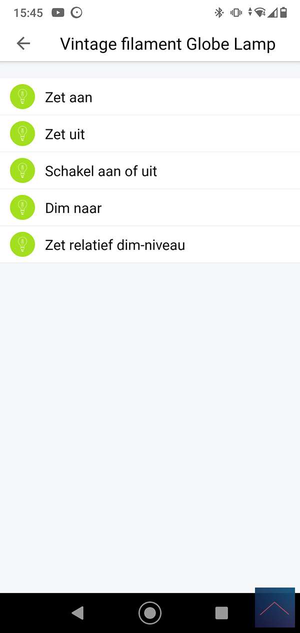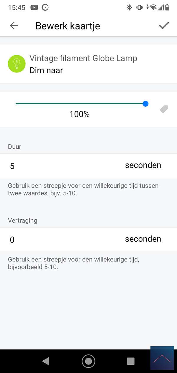 Je krijgt een aan-/uitschakelaar en je kunt de lamp dimmen. Het leuke bij de Homey is dat je bij de instellingen de transitie tijd kunt instellen (hoelang hij erover doet van aan naar uit).