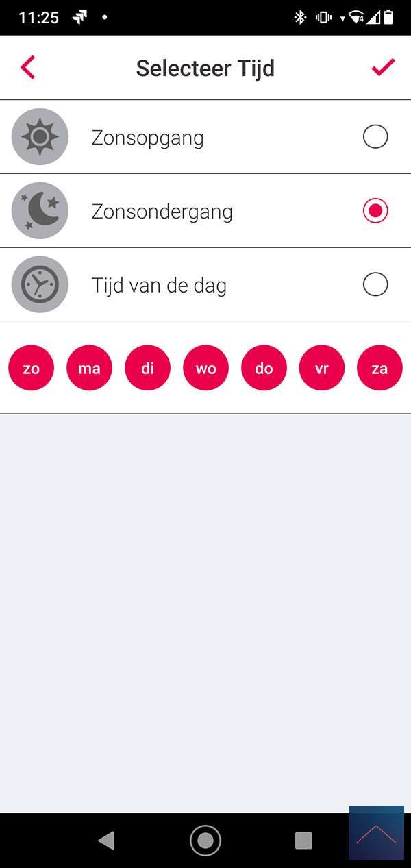 Ik wil graag dat als de zon ondergaat dat de tussen stekker aangezet wordt. Ik heb namelijk hier een staande lamp aan gekoppeld. Ik zet direct de hele woonkamer aan, wel zo handig.