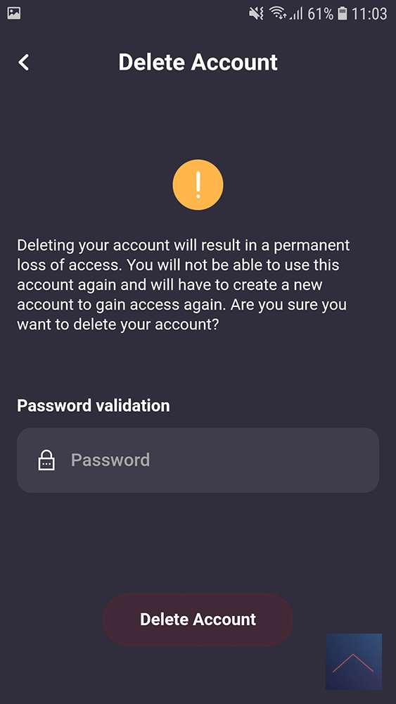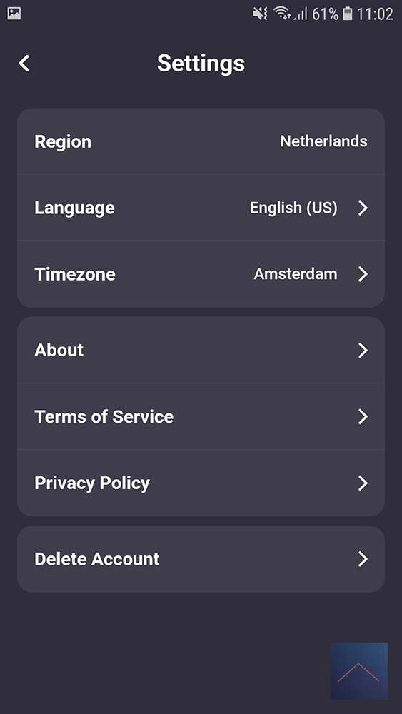 Onder de settings optie kun je je regio, taal en tijdzone instellen. Bij About kun je de app versie vinden en als je wilt kun je bij Terms of Service en Privacy Policy nalezen welke gegevens ze bewaren en wat ze ermee doen. Als laatste kun je bij Delete Account je account verwijderen, hiervoor heb je wel je wachtwoord nodig.