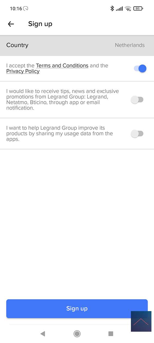 Zoals gebruikelijk moeten we eerst een account aanmaken d.m.v emailadres en wachtwoord. Als we in de laatste stap de voorwaarden/privacy bekijken zien we hier weinig bijzonders in staan. Zover we kunnen zien heeft alleen Legrand/Netatmo toegang tot jouw gegevens. Als je dit echt wilt weten is er een overzicht waar precies in staat wat er met jouw gegevens gebeurd. Hier kunnen andere fabrikanten een voorbeeld aan nemen.