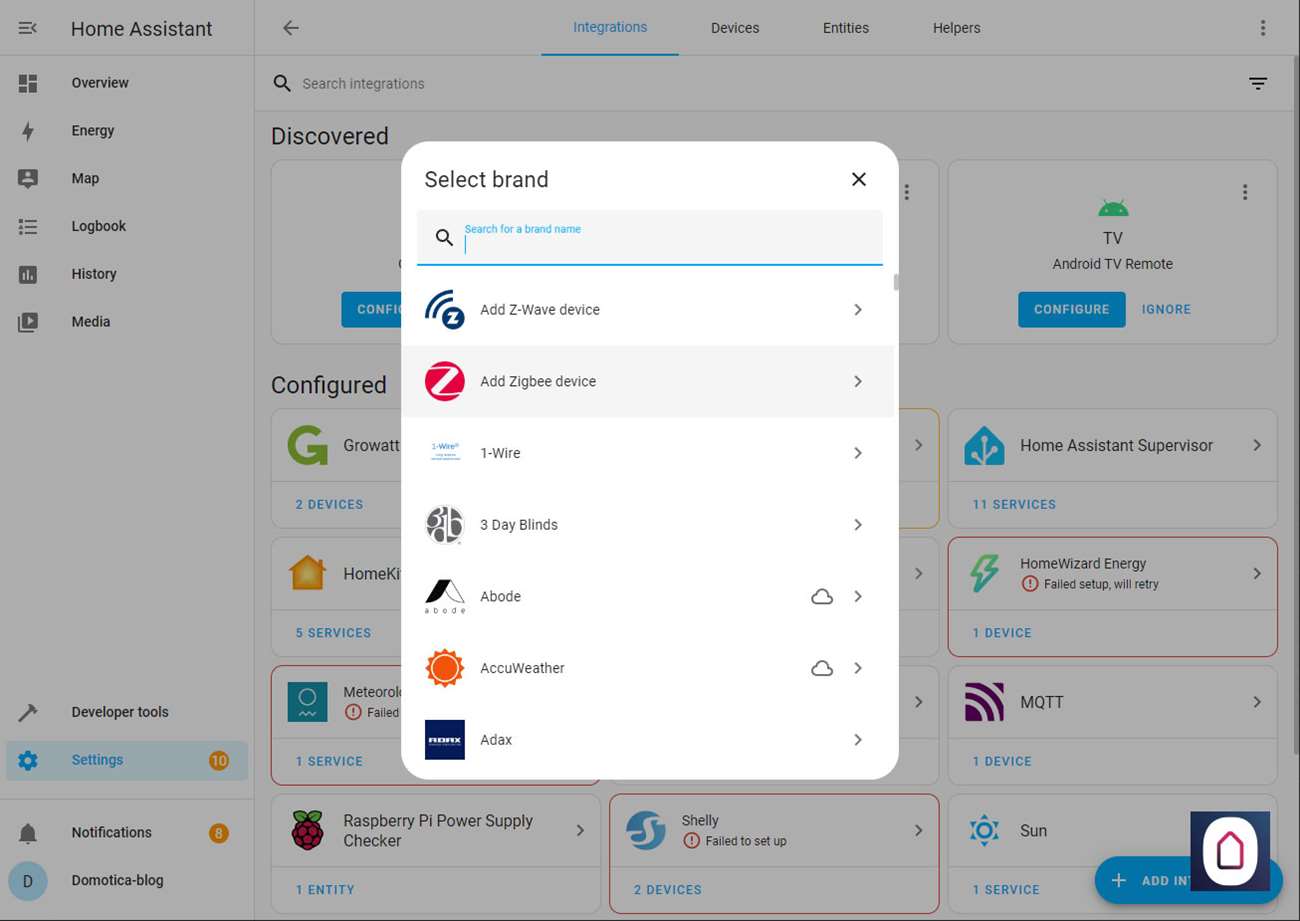 Deze stick moeten we installeren (mocht je dit nog niet gedaan hebben) op Home Assistent. Dit is heel eenvoudig want het is een kwestie van de stick in de PI te pluggen en dan naar de configuratie/integraties te gaan. Je ziet hem dan direct staan. Nu moet je nog wat stappen doorlopen en dan zal hij automatisch worden toegevoegd.