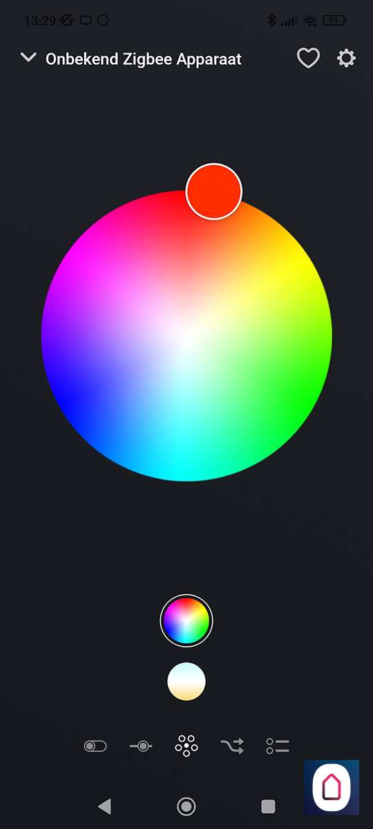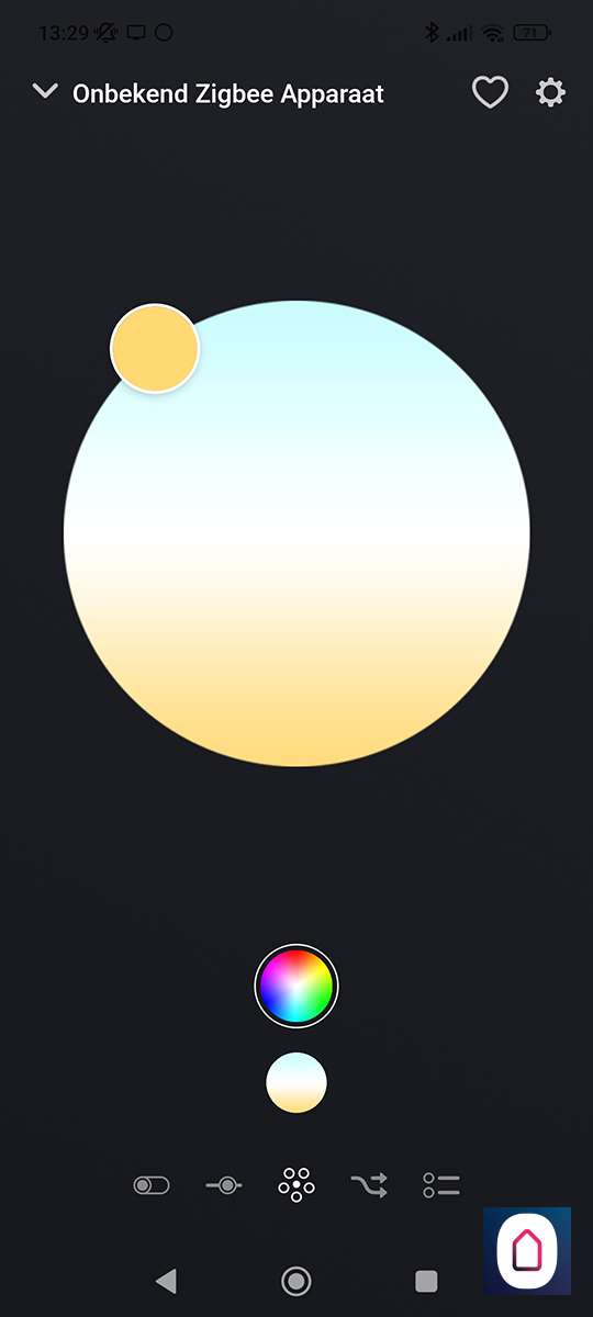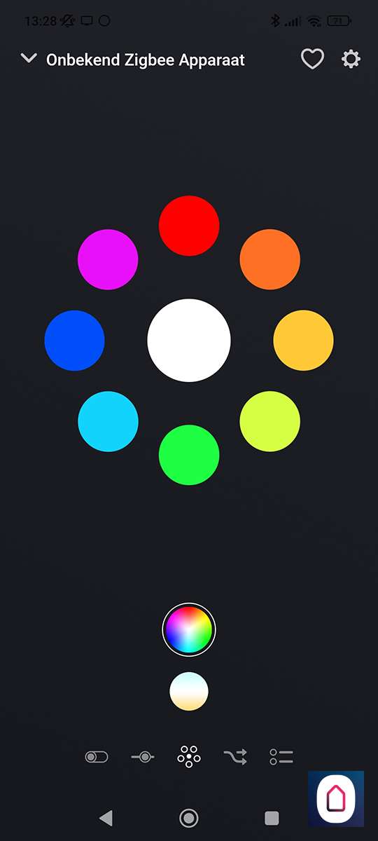 Je kunt de lamp aan- en uitzetten, het dimniveau bepalen, de kleur van de witte LED veranderen (warm/koud) en hem een vast kleur geven via de RGB led's. Helemaal compleet dus.
