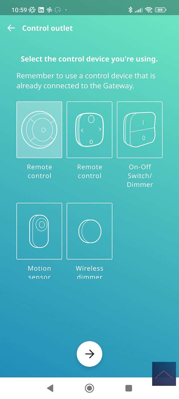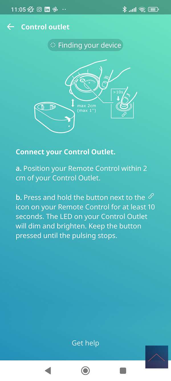 We moeten de tussenstekker via een afstandsbediening aan de HUB koppelen. We selecteren dus deze optie. Vervolgens drukken we het knopje aan de bovenkant 5 seconden in en hierna het knopje van de de afstandsbediening 10 seconden. We zien de plug wit knipperen en zien het lampje op de afstandsbediening ook knipperen. De APP geeft vervolgens een melding dat hij aan het zoeken is maar hij wordt niet gevonden. Helaas werkt deze plug dus niet met de Ikea hub.