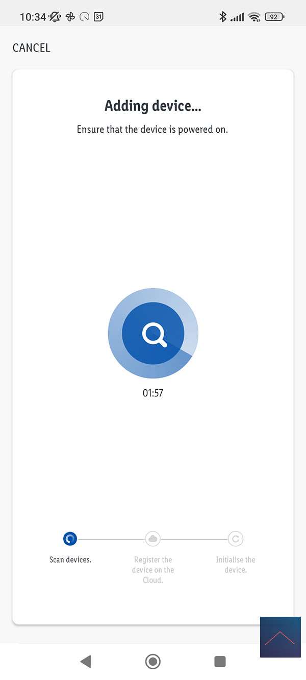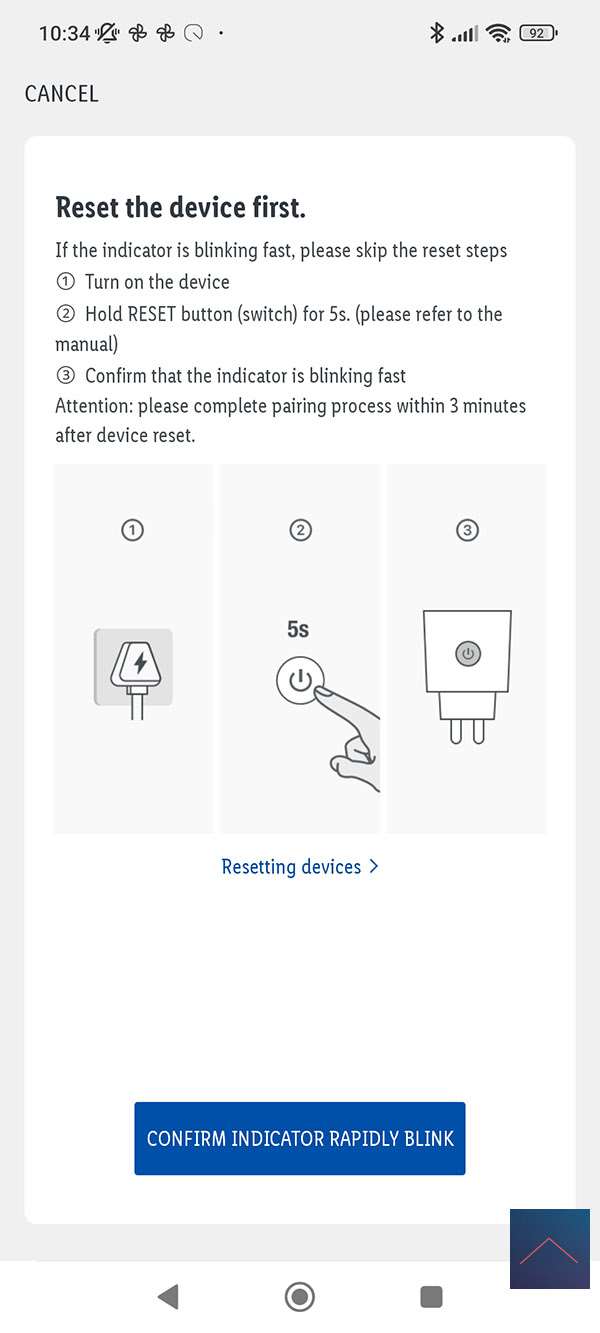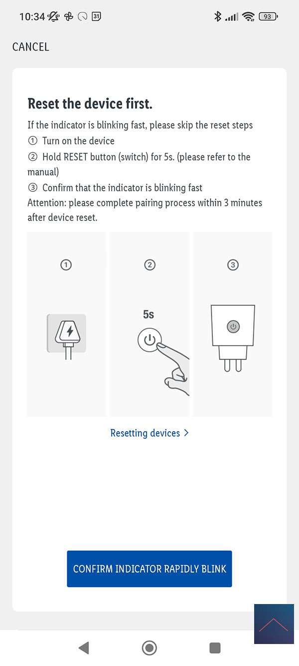 Als de LED knippert kunnen we doorgaan en het zoeken starten. Indien de LED niet knippert moet je hem even resetten door het knopje aan de bovenkant 5 seconden ingedrukt te houden. Na enkele seconden wordt de stekker gevonden en kunnen we hem gebruiken.