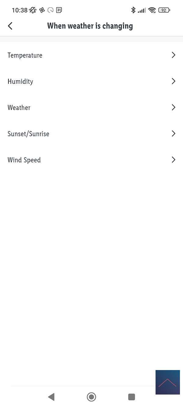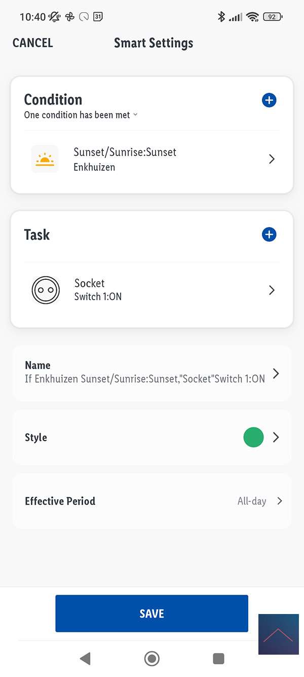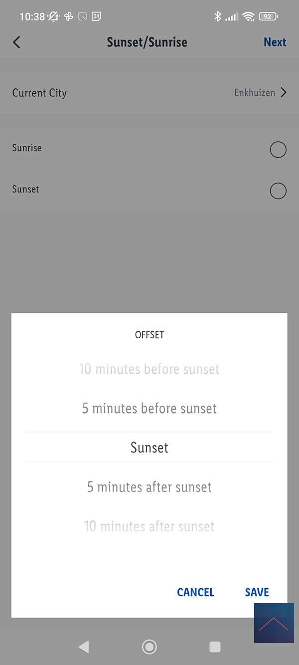 Nu drukken we op "when weather is changing", sunset/sunrise en selecteren vervolgens sunset. De volgende stap is om te zorgen dat de stekker aangezet wordt. Dus deze selecteren we en slaan na een paar stappen het geheel op.