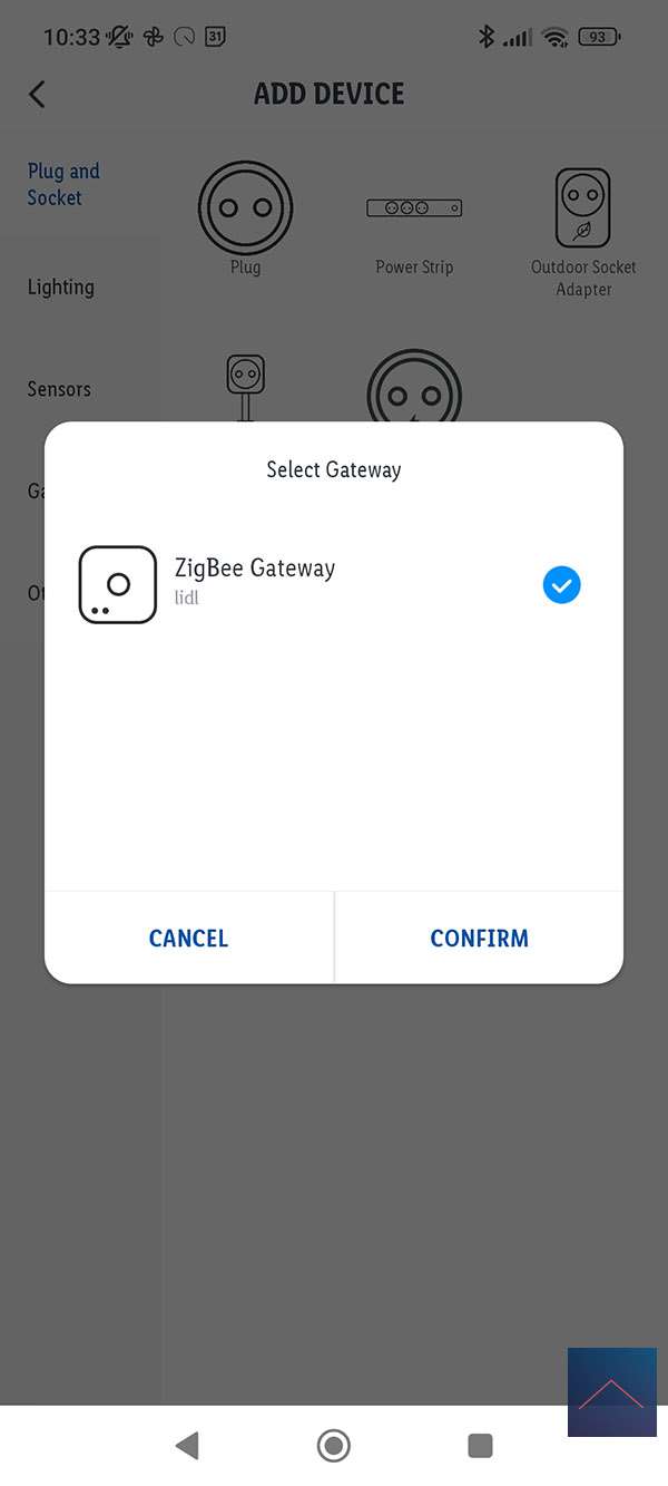 Nu drukken we 1x op de knop aan de bovenkant en de LED zal oplichten. Nu drukken we op het plusje in de APP om een nieuw apparaat toe te voegen en kiezen de "gateway" en dan "stekker" en vervolgens de tussenstekker (zonder stroom icoon).