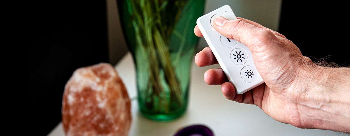Deze set is voorzien van een afstandsbediening waarmee je op afstand je lampen aan/uit kunt zetten. Deze afstandsbediening zal je niet zo snel raken want de knoppen zijn mega groot. Het doet me een beetje denken aan zo'n bejaarden telefoon. Hij is voorzien van 4 knoppen; aan/uit en 2 dimknoppen (feller, minder fel).