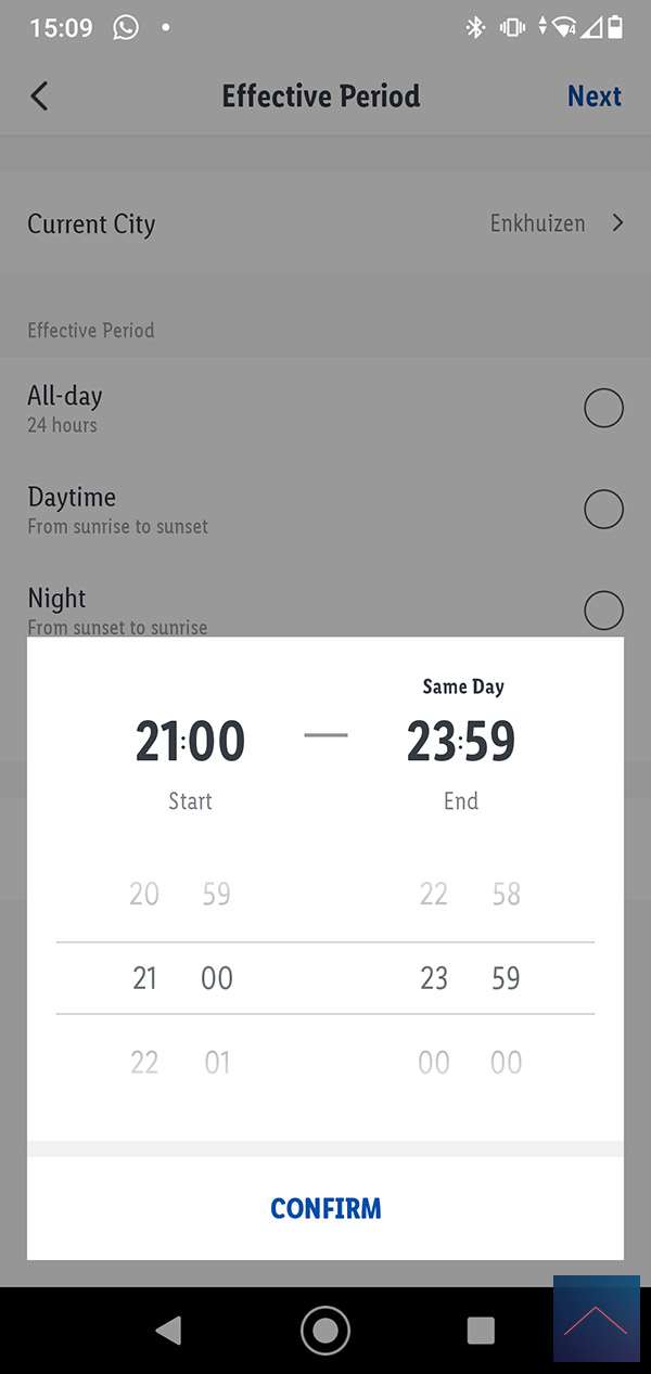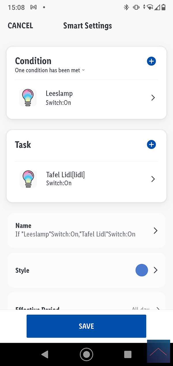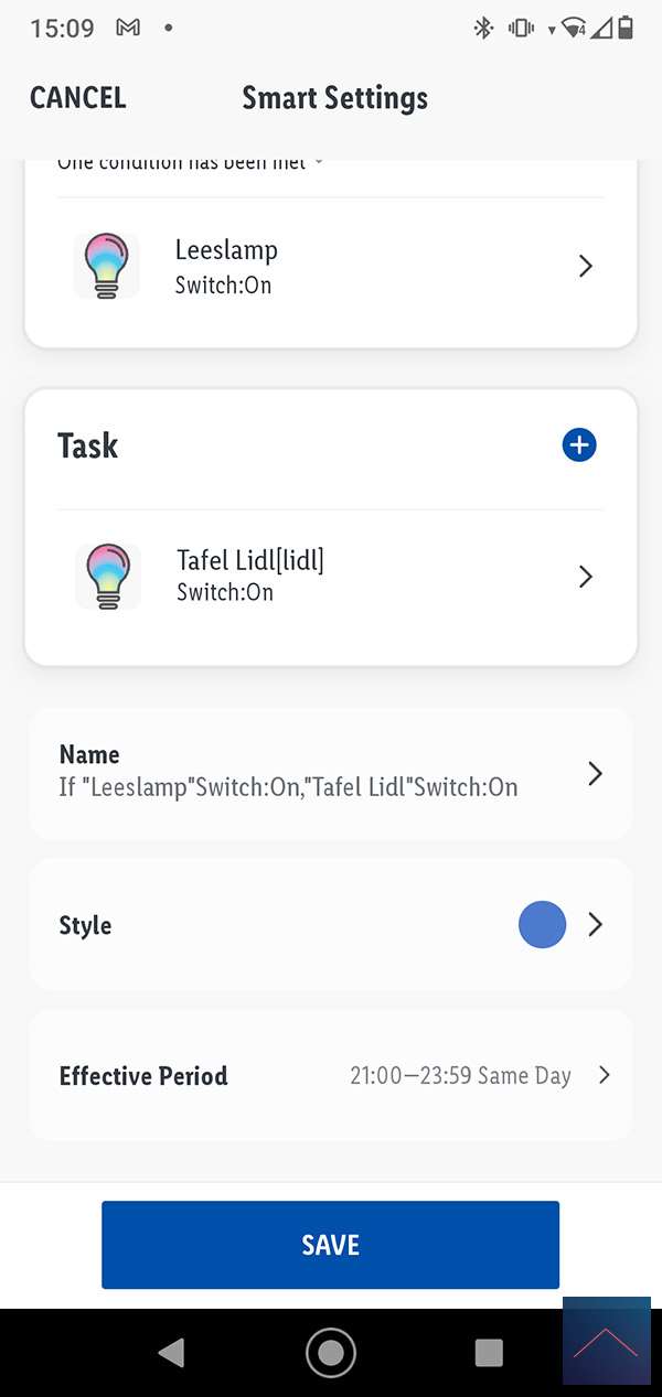 Dit is natuurlijk allemaal redelijk simpel. Maar nu willen we ook nog dat dit alleen na 21.00 uur gebeurd en dat de leeslamp op een gele kleur wordt gezet. Om dit te bereiken klikken we op het plusje bij de conditie (leeslamp) en voegen hier de tijd in. Maar hier lopen we tegen een beperking aan wat we willen, dat als de lamp ergens na 21.00 aan wordt gezet, dat dan de scene mag draaien. Deze optie is er niet bij de conditie kolom. Een workaround hiervoor is om de "Effective period" te gebruiken. Hier kun je namelijk een eind en begin tijd opgeven.