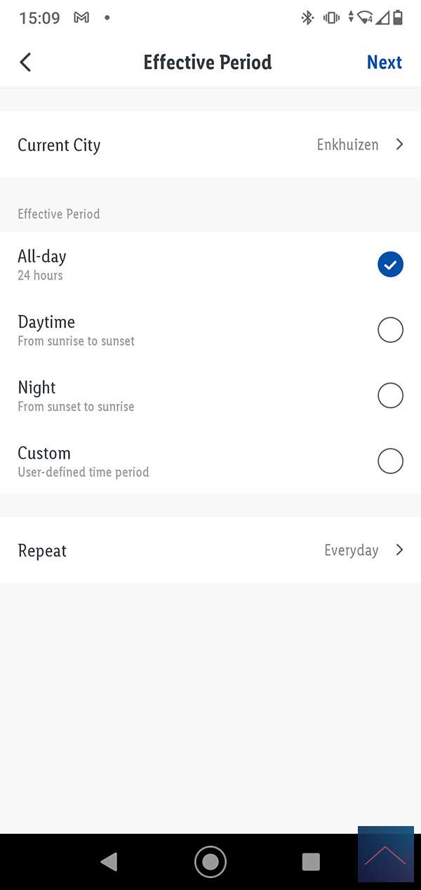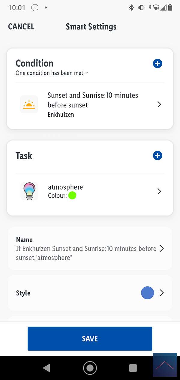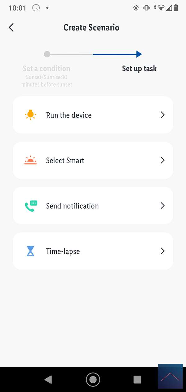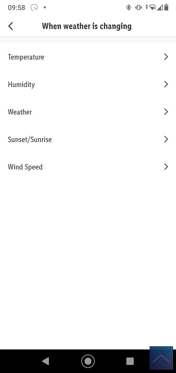 De 2de conditie is het weer. Een onderdeel hiervan is ook de zonsondergang en zonsopgang. De 3de optie is op tijd/dag en de laatste als de status van een apparaat gewijzigd is, dus als een lamp y is aangezet dan moet je lamp x ook aanzetten.