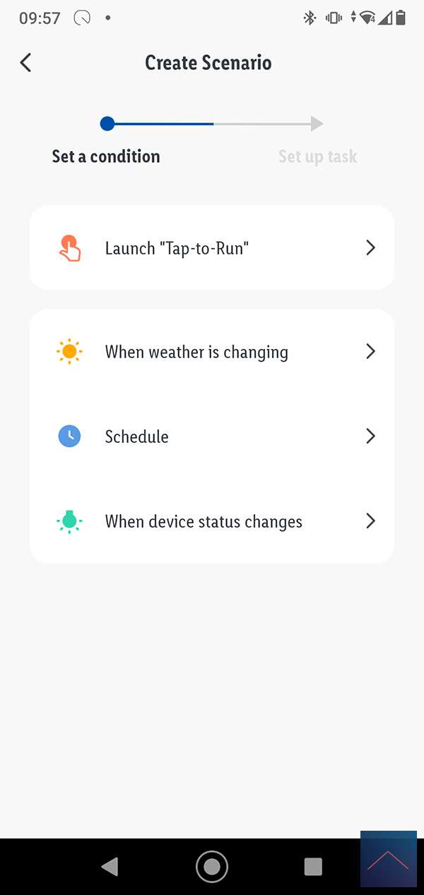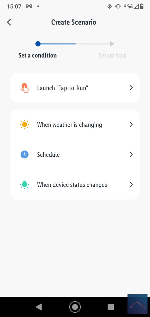Om een smart scene te maken klik je op het plusje in de bovenhoek. De eerste stap is om de conditie (trigger) in te stellen. Dit bestaat uit 4 delen. Een "Launch Tap To Run" hiermee krijg je een knop om de scene te starten. Dit kan handig zijn om bv een sfeer je woonkamer te maken. Je kunt met deze optie ook een andere scene starten