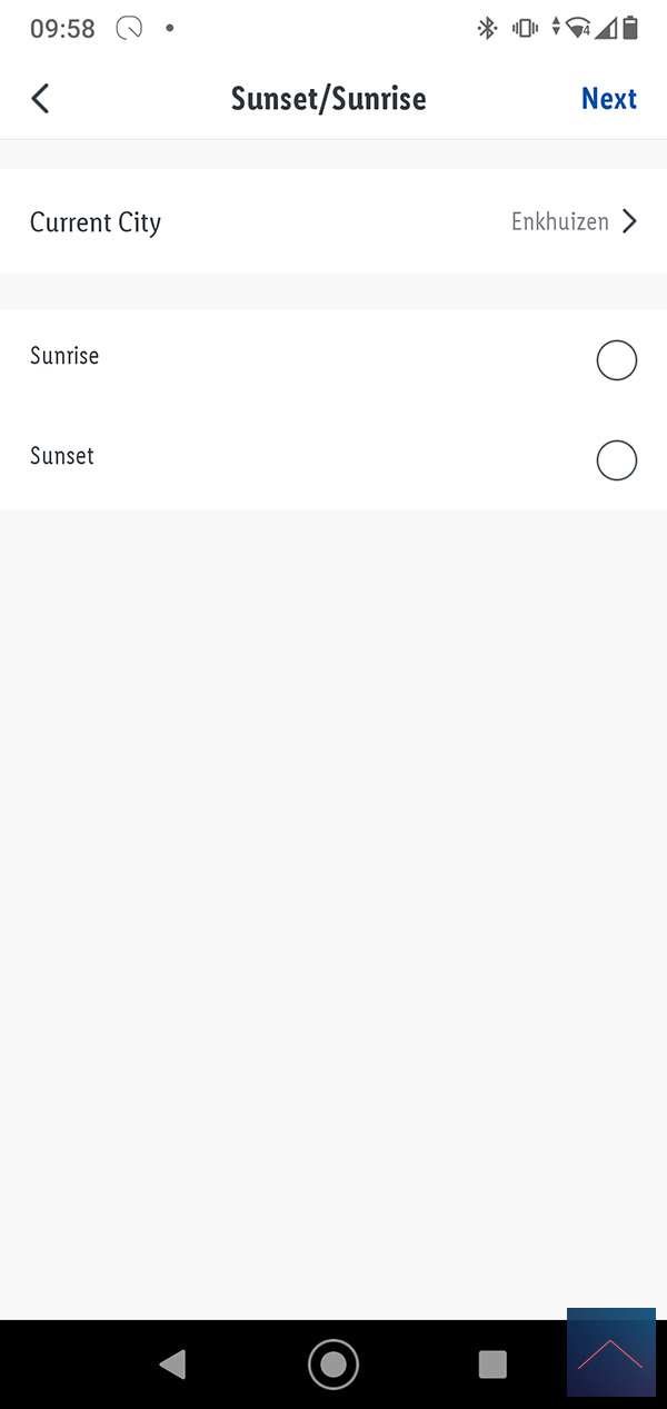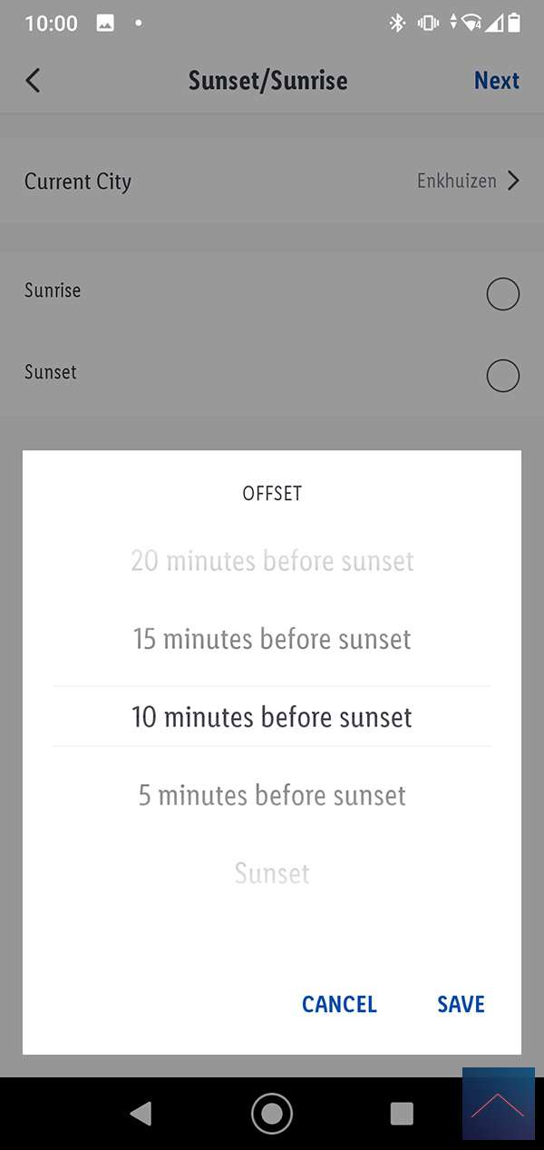 Laten we een scene maken waarbij, als de zon onder gaat, de lamp wordt aangezet op een gele kleur. We drukken op het plusje en selecteren "When weather is changing" en klikken op sunset/sunrise. Nu selecteren we sunset en krijgen de optie om een "offset" in te stellen. Hiermee kunnen we bv zeggen dat we 10 min. voor de zonsondergang de scene al willen starten. Dit is wel een aardige optie dus kiezen we hiervoor.