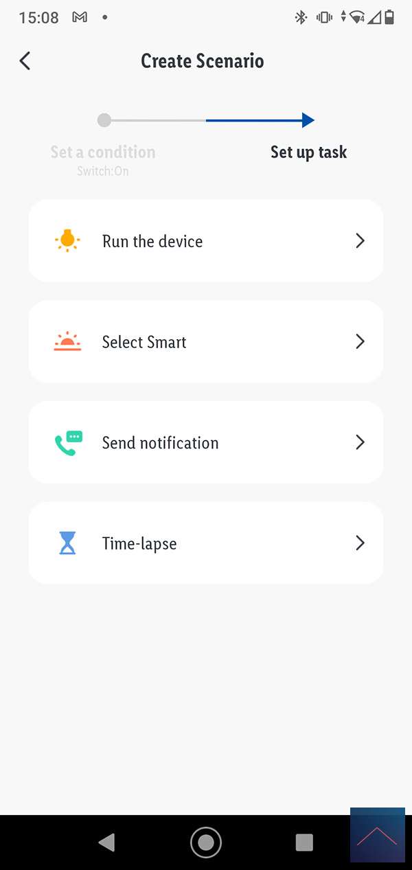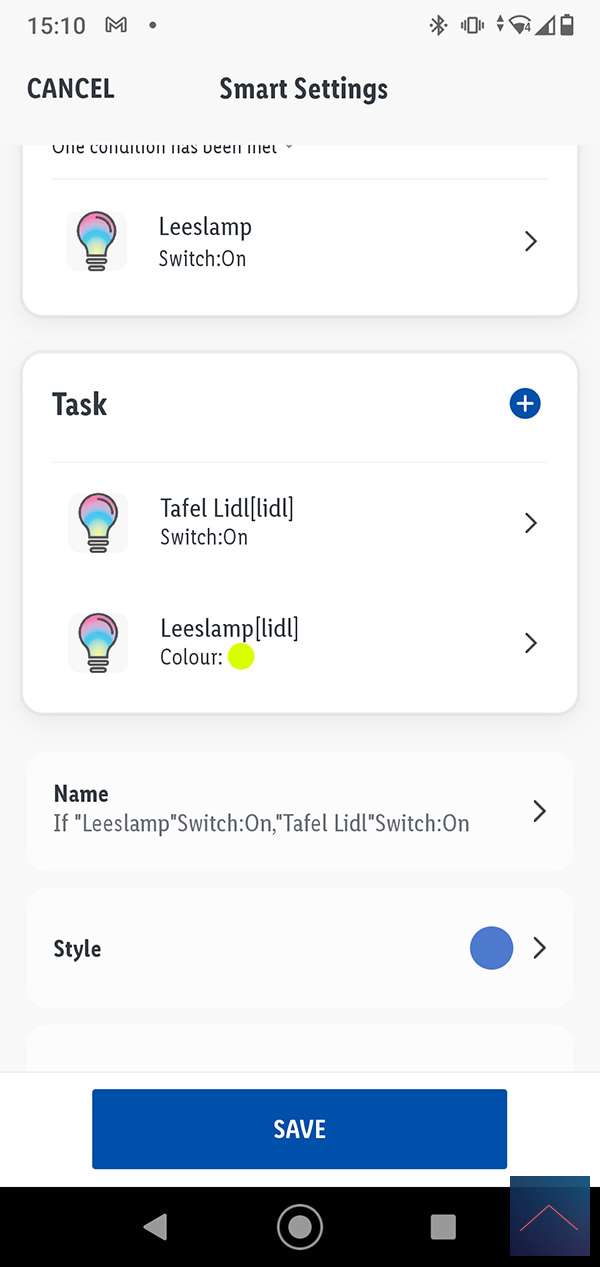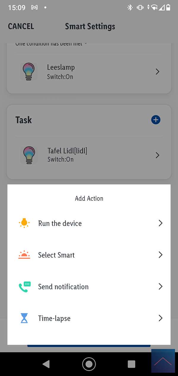 Nu willen we graag een scene maken waarbij als je de leeslamp aanzet je ook de tafel lamp aanzet. We gaan weer naar smart en drukken op het plusje. We selecteren nu "When device status change" en de leeslamp. Bij de volgende stap zorgen we dat de eettafellamp aangezet wordt. Dus selecteren Run Device en selecteren de de Tafellamp en volgen de stappen om deze aan te zetten.