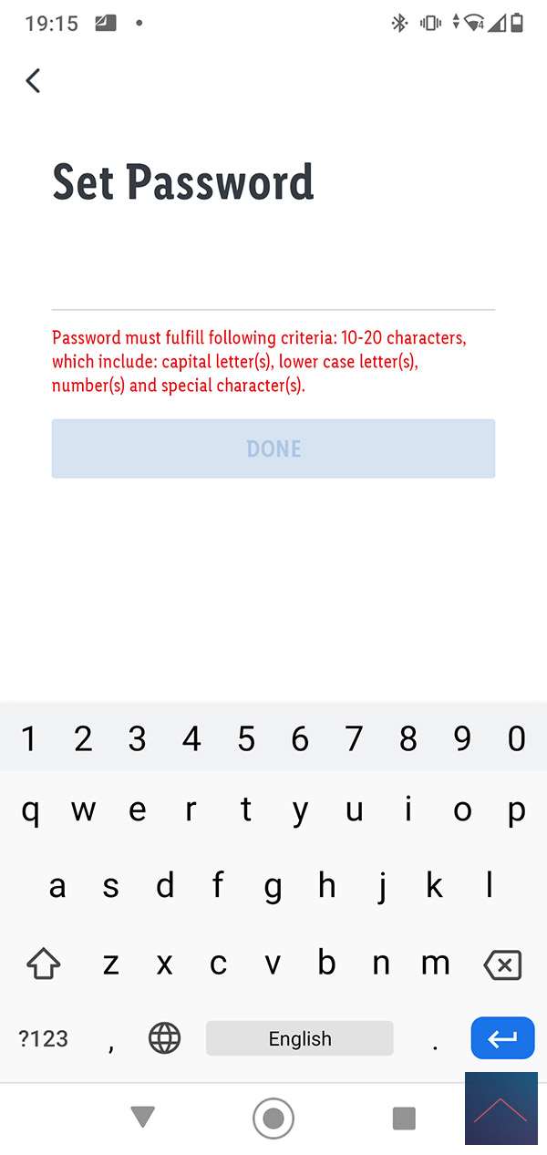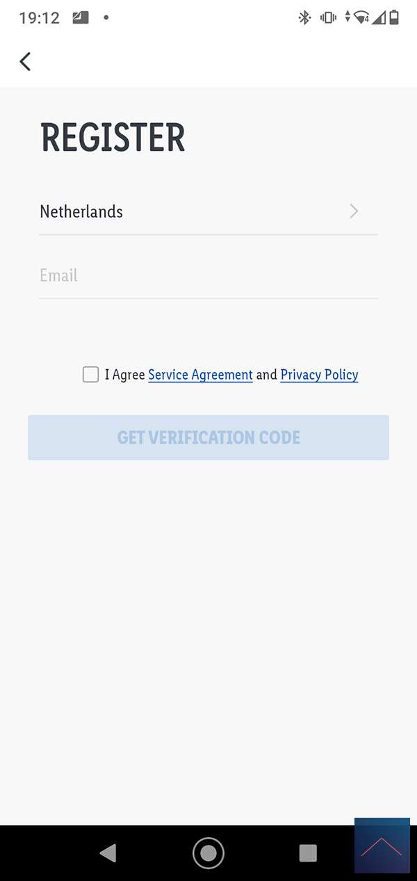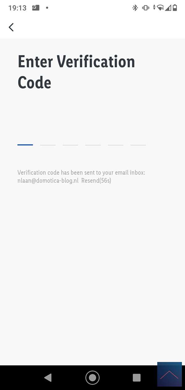 Om verder te gaan maken we een account aan door je e-mailadres op te geven. De APP zal een mail sturen met een verificatie code. Er is dus goed nagedacht over de beveiliging. Ook het opgeven van je wachtwoord moet aan bepaalde eisen voldoen.