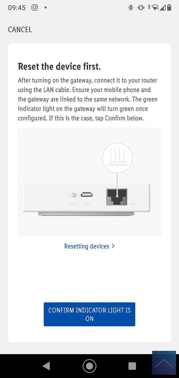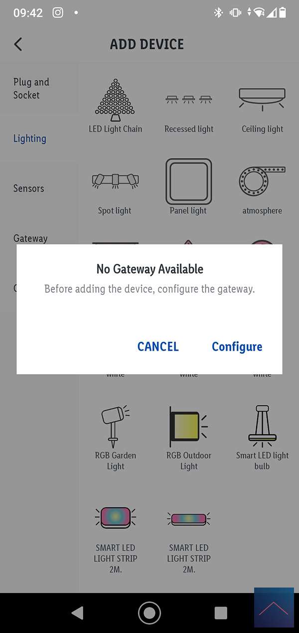 Om de gateway toe te voegen drukken we op de "add device" knop op de home. Je krijgt vervolgens een overzicht van apparaten die je kunt toevoegen. We kiezen "gateway" en we krijgen een uitleg dat de lampjes groen moeten branden. Zorg dat je op je mobiel verbonden bent met hetzelfde netwerk anders gaat hij de gateway niet vinden. Het duurde bij mij best lang tot hij hem gevonden had. Heb dus even geduld.