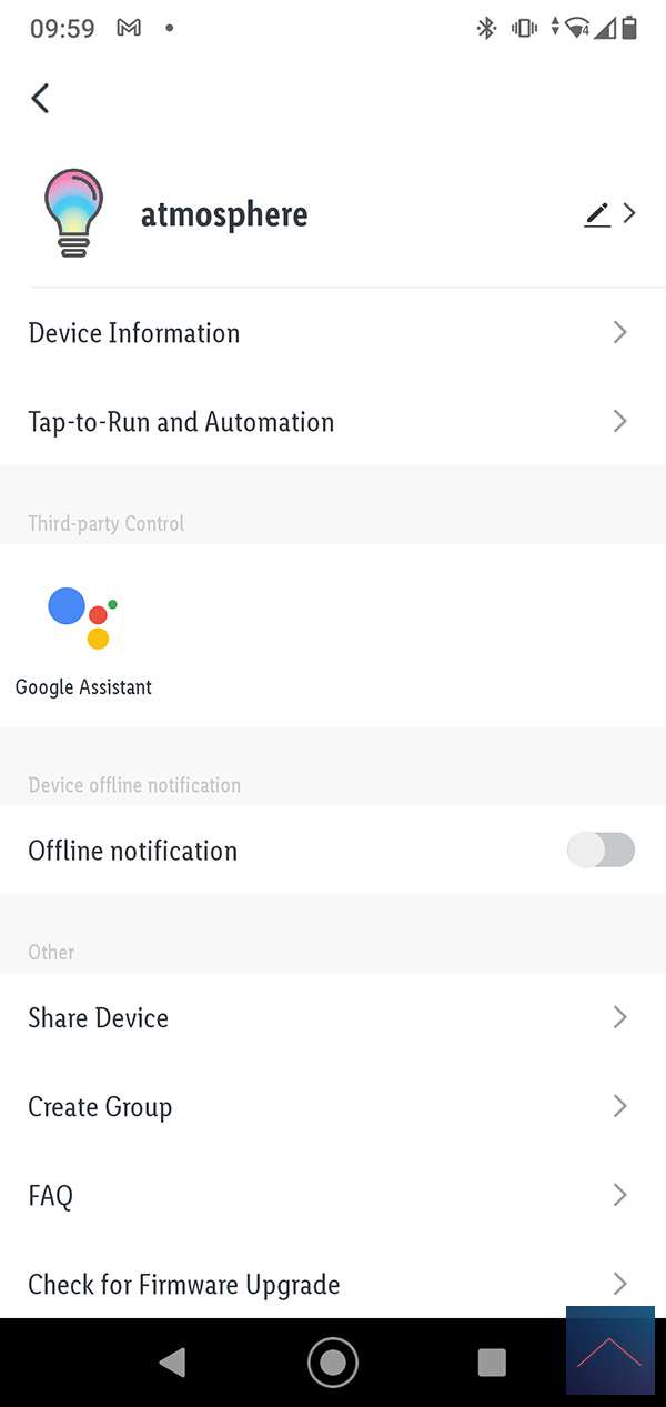 Bij de configuratie (potloodje rechts bovenin) kun je de naam van het apparaat wijzigen, een notificatie sturen als hij offline is, het apparaat delen en hem in een groep zetten. Je vindt hier ook de optie om de firmware te upgraden.