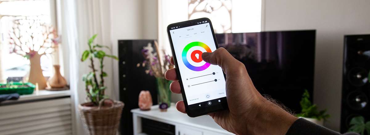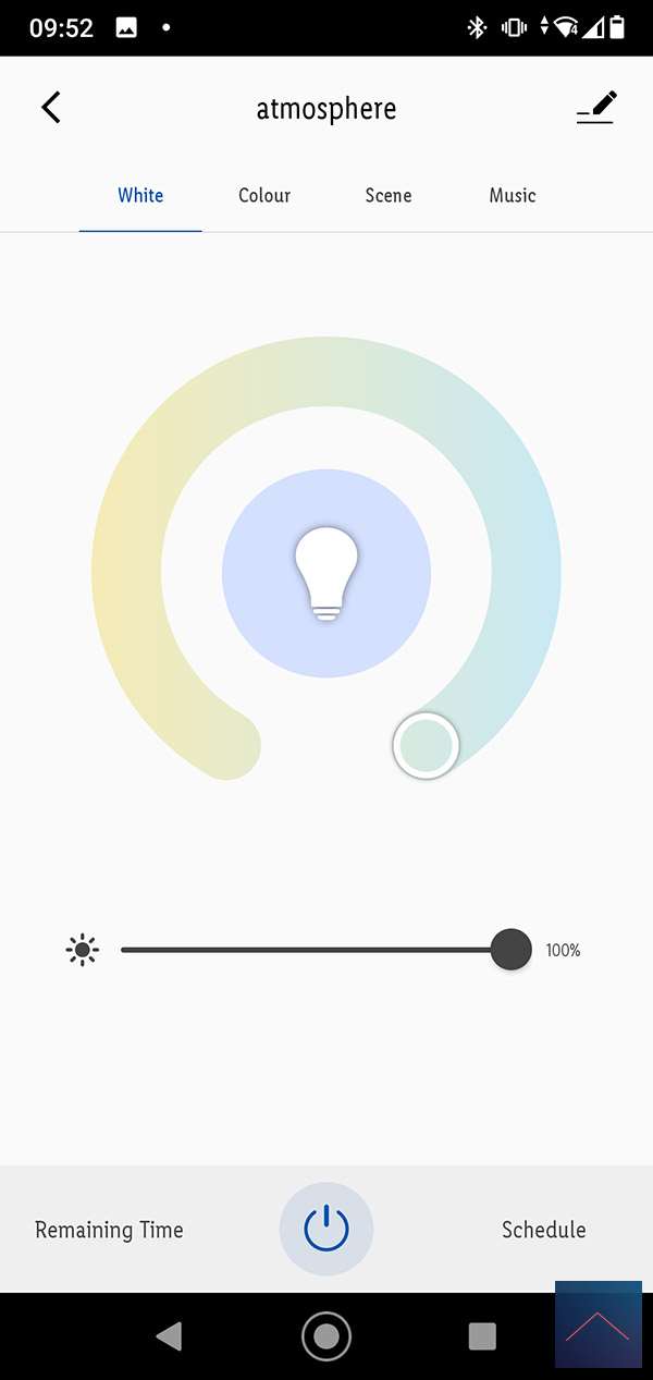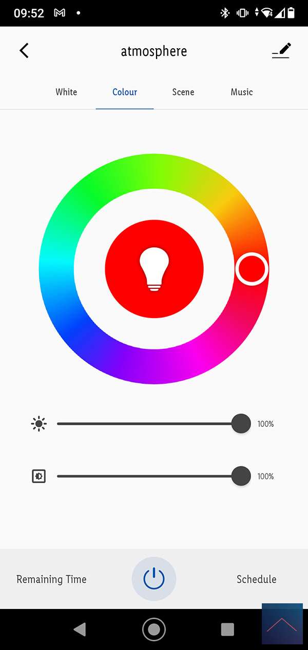 Ik kan hem nu bedienen. Je kunt de kleuren veranderen, hem dimmen en natuurlijk aan-/uitzetten. Wat opvalt is dat de lamp een zeer irritant zoom geeft als ik hem op de witte kleur heb staan.