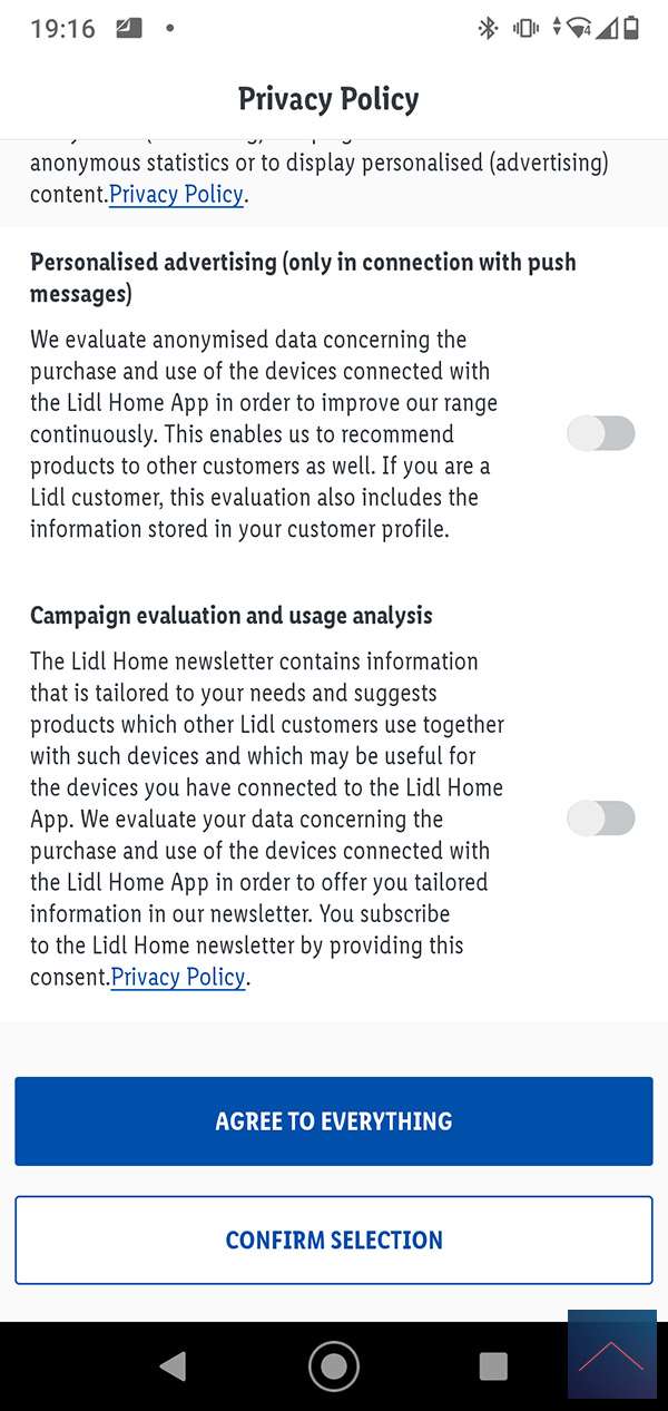 Ook opvallend is dat er gevraagd wordt of je personaliserende advertenties wilt zien (van bv Vodafone, EON en Lidl). Deze optie zetten we natuurlijk niet aan. Er wordt ook gevraagd of je je wilt aanmelden voor de nieuwsbrief.