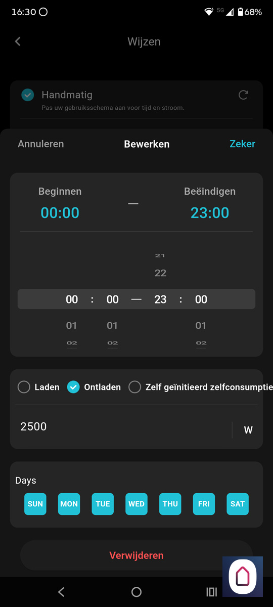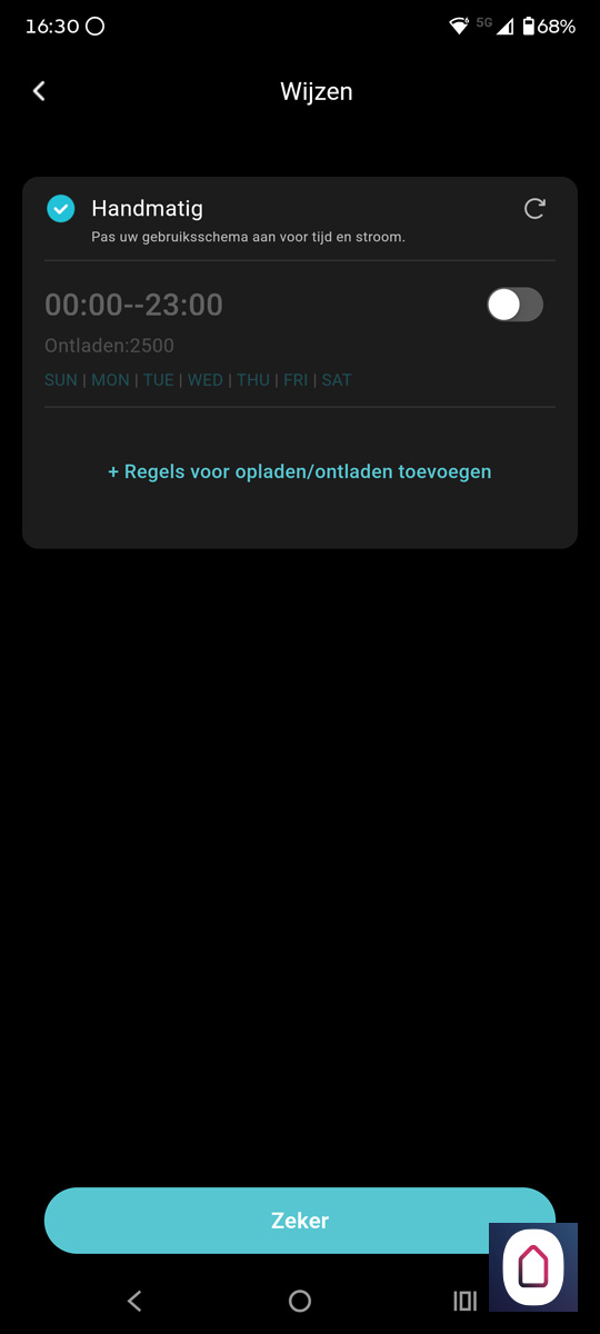 In de handmatige modus kun je zelf bepalen wanneer de batterij moet laden of ontladen.
