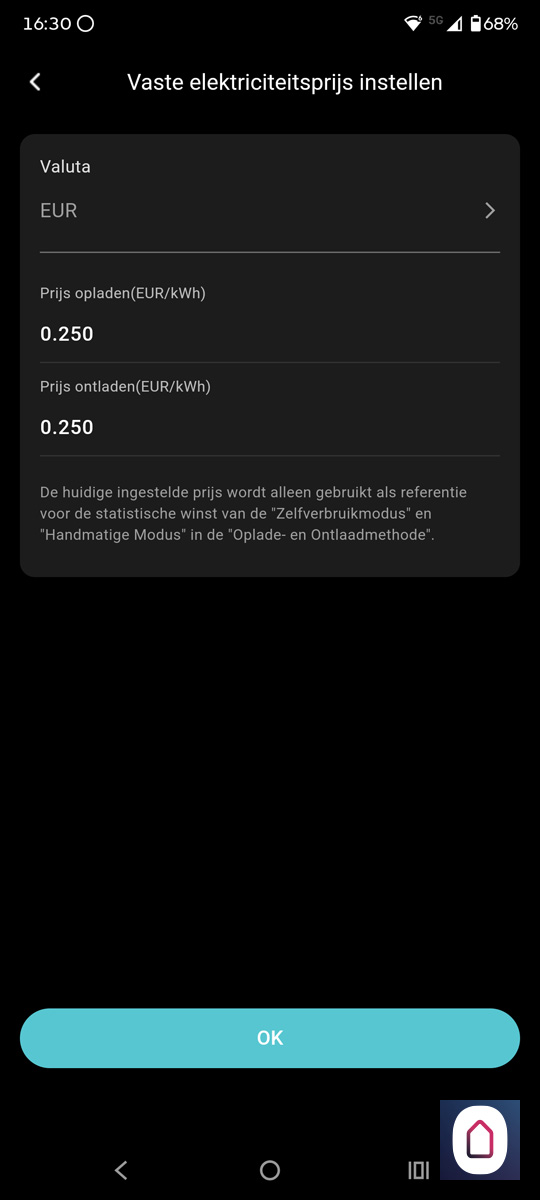 Wanneer je geen dynamisch contract hebt, kun je hier een vaste stroomprijs instellen. De batterij rekent dan met dat vaste tarief voor interne berekeningen van winst en optimalisatie.