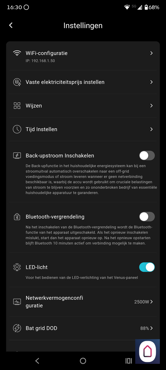 Via het tandwiel rechtsboven in het startscherm kom je in het instellingenmenu van de Marstek Venus 3. Hier vind je alle technische opties en configuraties van de batterij.