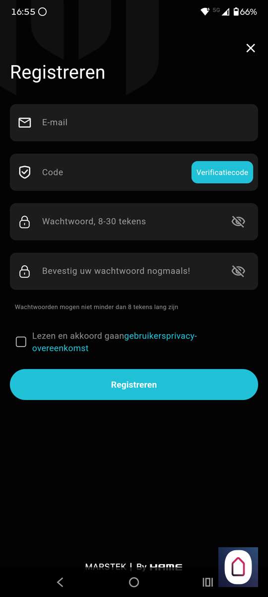 Na het openen van de app moet je een account aanmaken. Dat gaat via je e-mailadres. Je voert je e-mailadres in, vraagt een verificatiecode op en krijgt deze per mail toegestuurd. Vervolgens stel je een wachtwoord in.