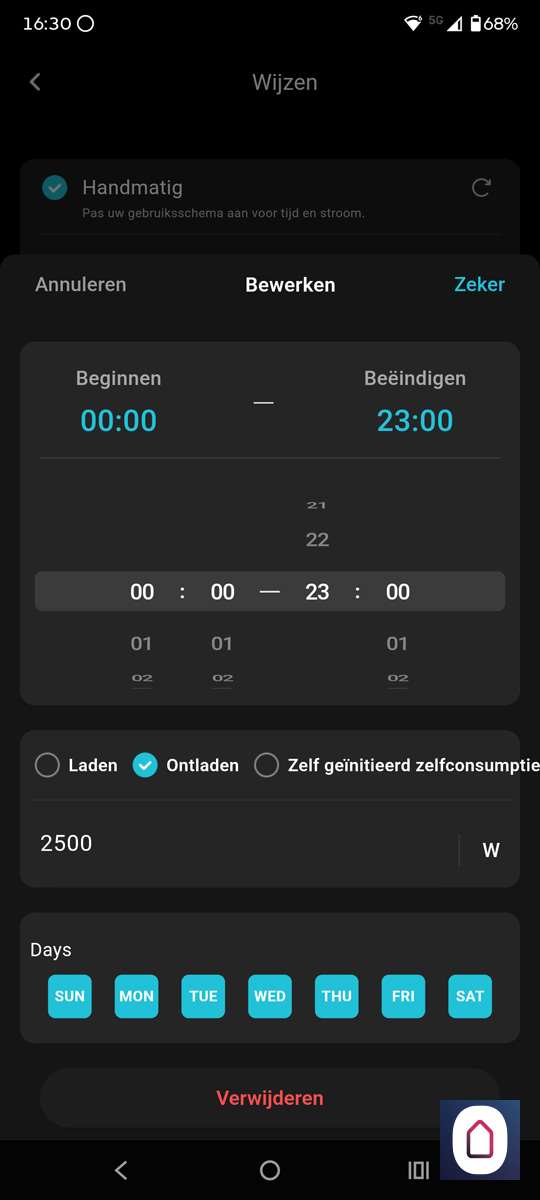 - Je kunt ook handmatige aansturing kiezen, waarbij je zelf bepaalt wanneer de batterij laadt of ontlaadt.