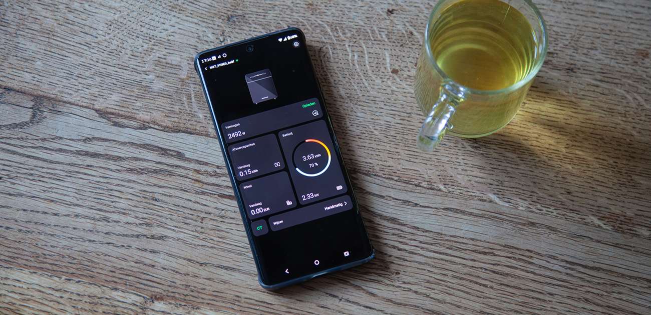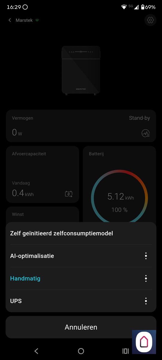 Daarnaast zie je de huidige werkmodus, in dit geval “Zelf geïnitieerd”. Dat betekent dat de batterij op dat moment handmatig of volgens een specifieke ingestelde modus werkt en niet volledig automatisch via AI.