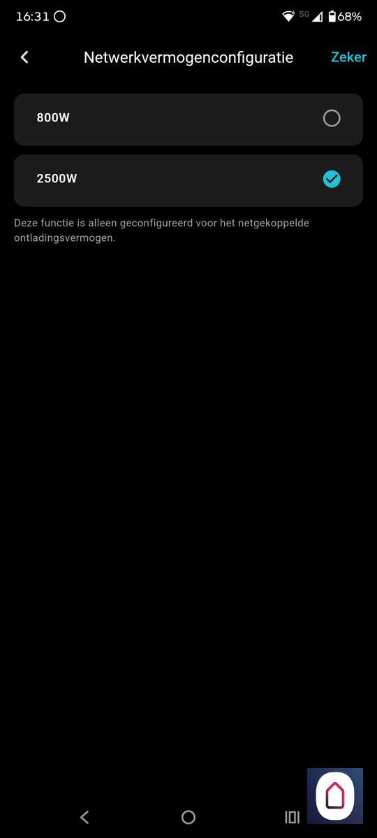 Hier stel je het maximale laad- en ontlaadvermogen in, bijvoorbeeld 800W of 2500W.