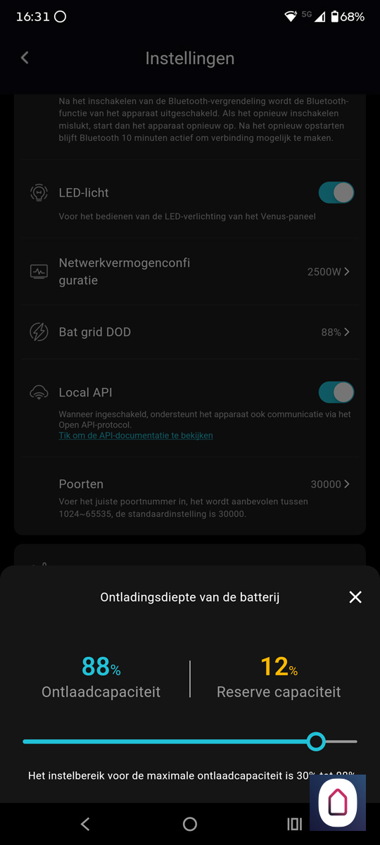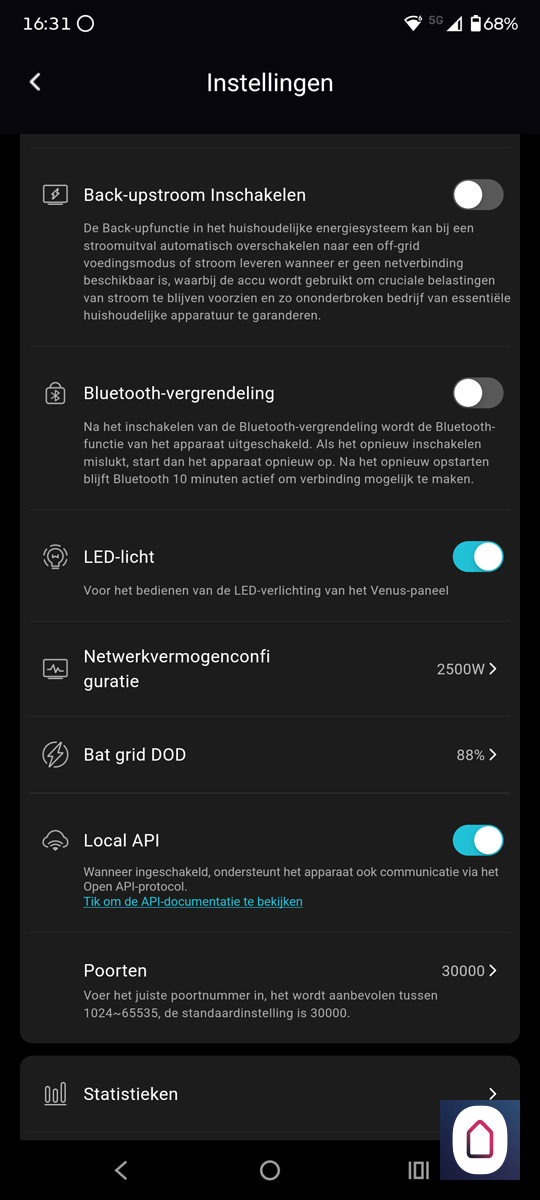 Wanneer je de Local API inschakelt, ondersteunt het apparaat communicatie via een open API protocol. Dat betekent dat je de batterij lokaal kunt uitlezen of integreren in bijvoorbeeld Home Assistant of andere domoticasystemen.
