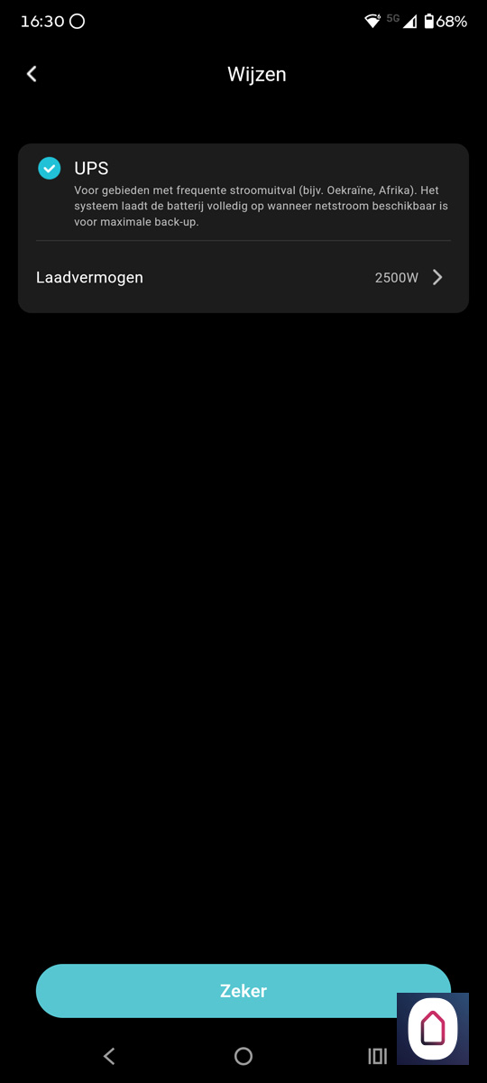 Het is goed om te weten dat dit geen volledige huis-backup is via de meterkast. Het gaat om de noodstroomuitgang op het apparaat zelf.