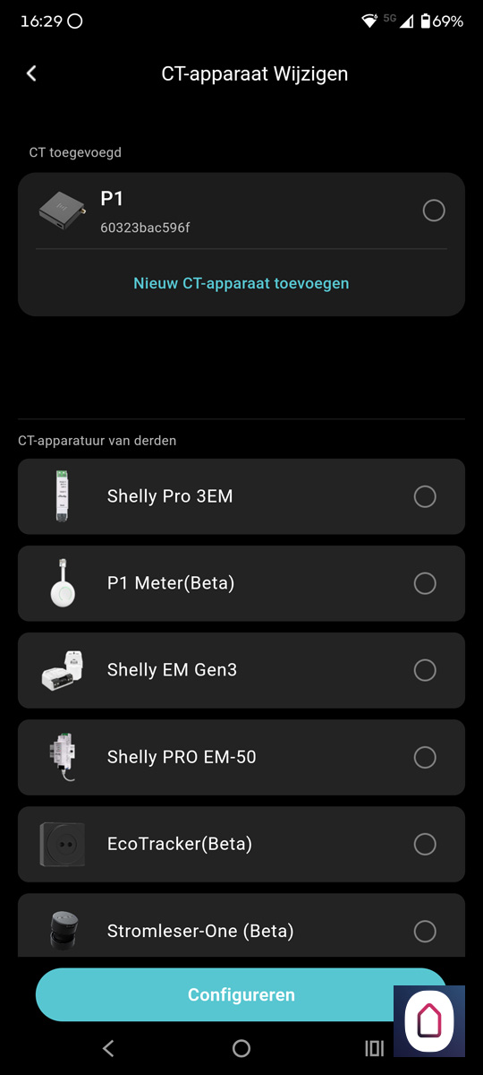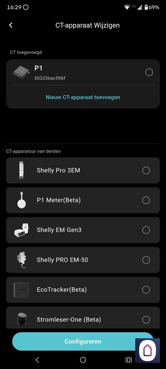 Onderaan zie je een knop voor CT of de gekozen meetmethode. Hier kun je zien of de batterij werkt op basis van een CT meter of bijvoorbeeld een P1 meter.