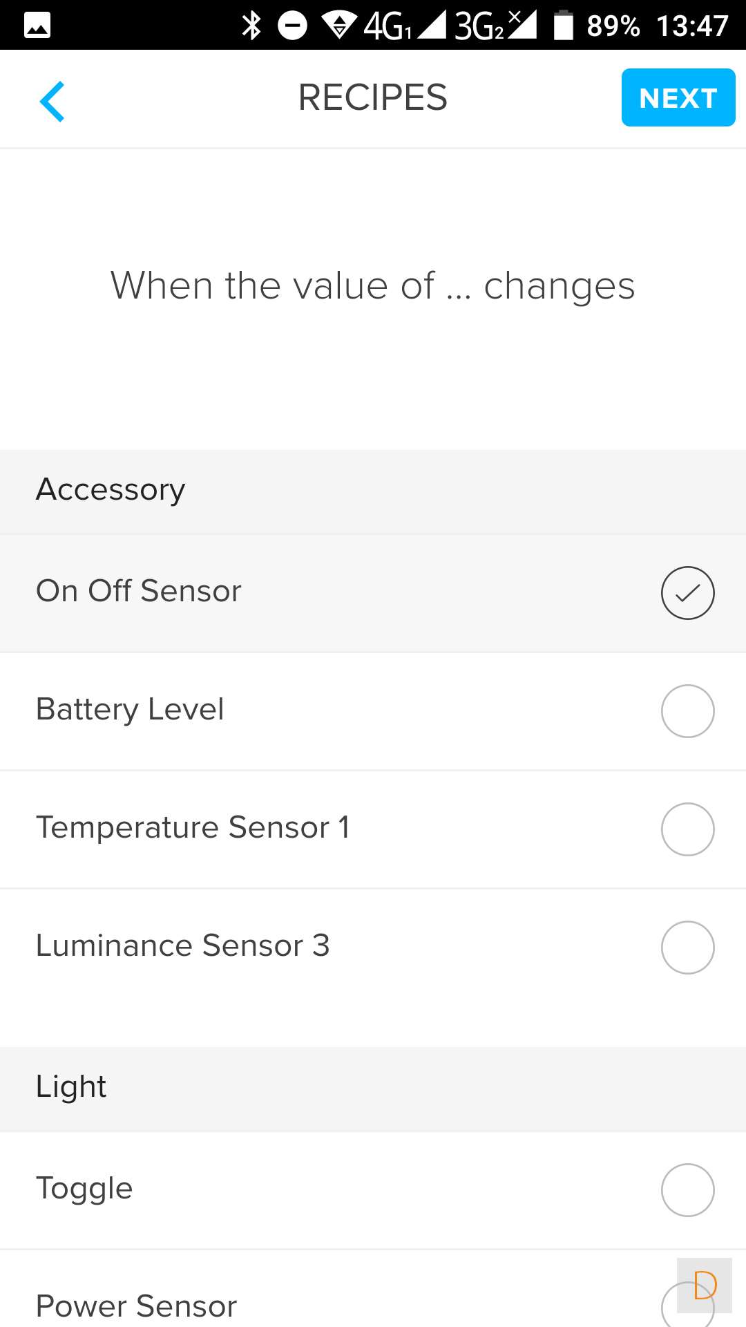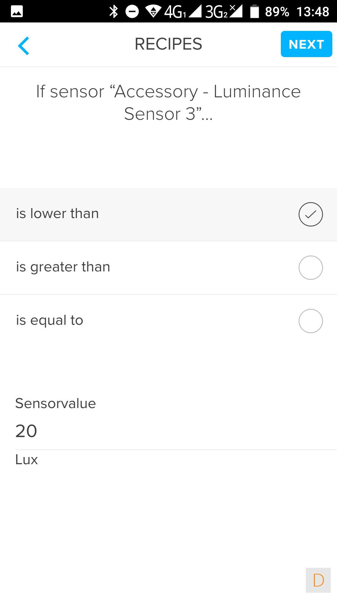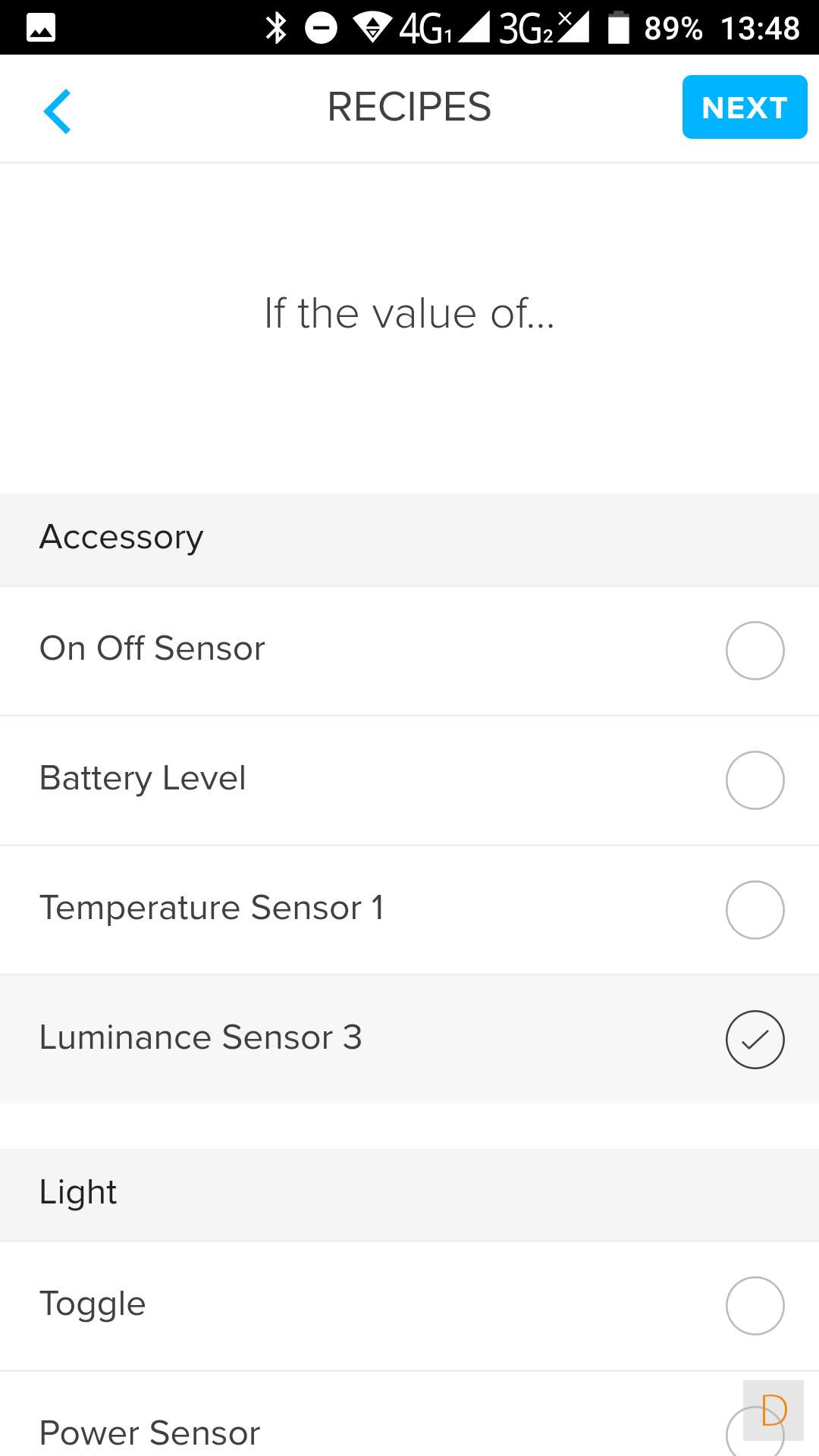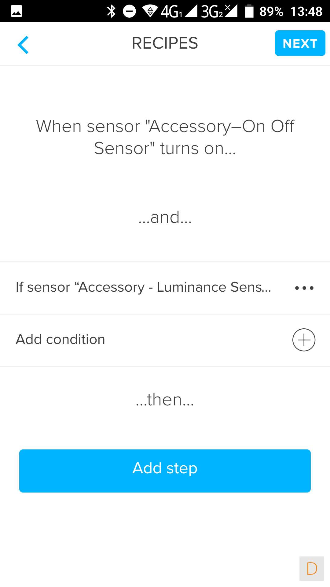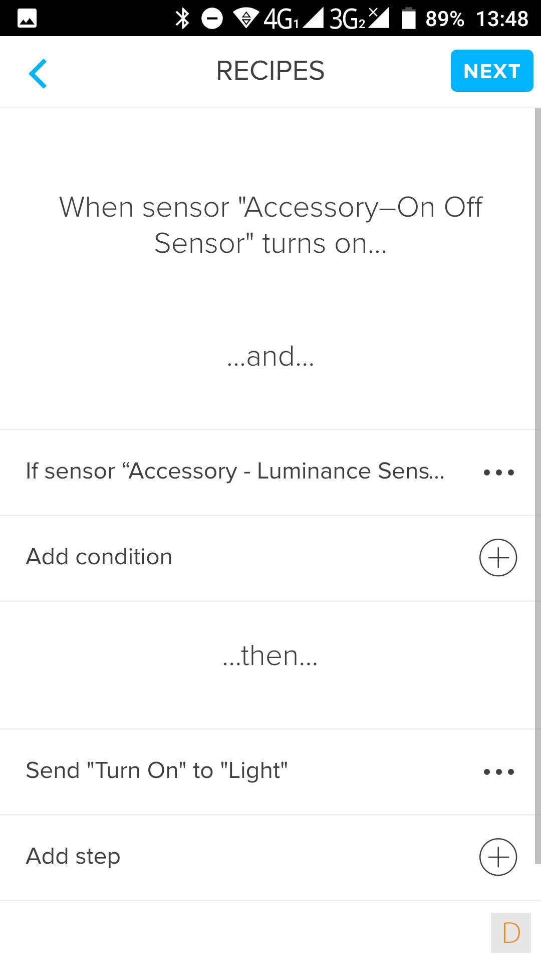 2de regel wil ik gebruik maken van 2 Z-Wave apparaten: Een bewegingsmelder en tussenstekker. Ik wil dat als er beweging en een bepaalde lichtsterkte is, er een lamp aangezegd wordt.
