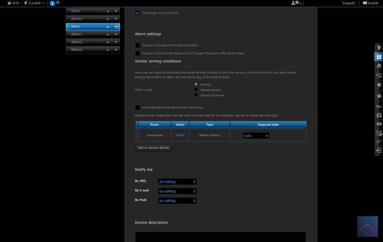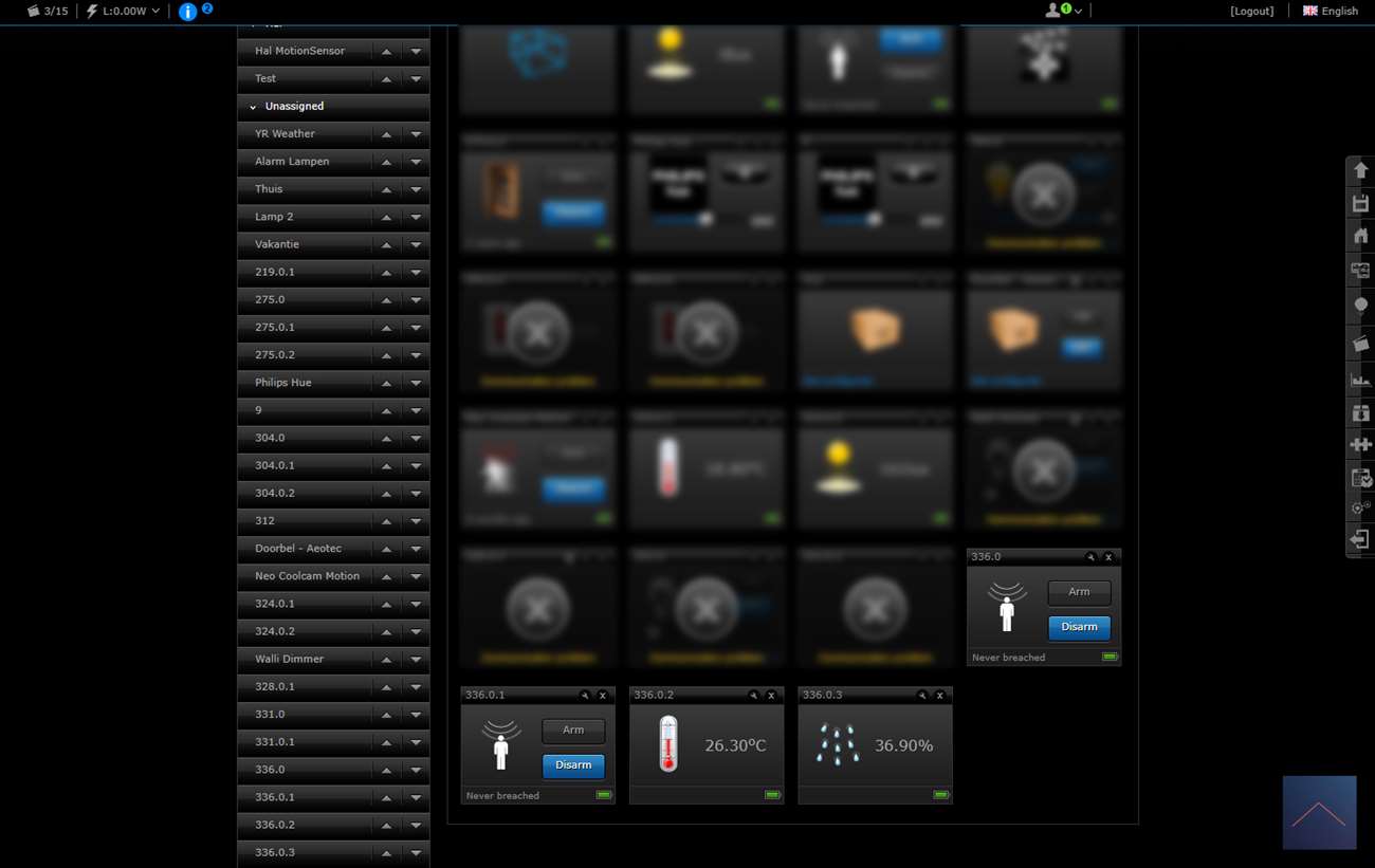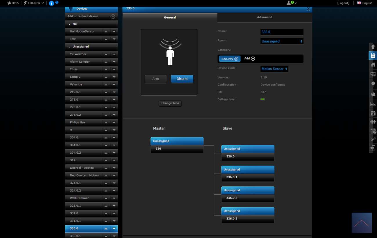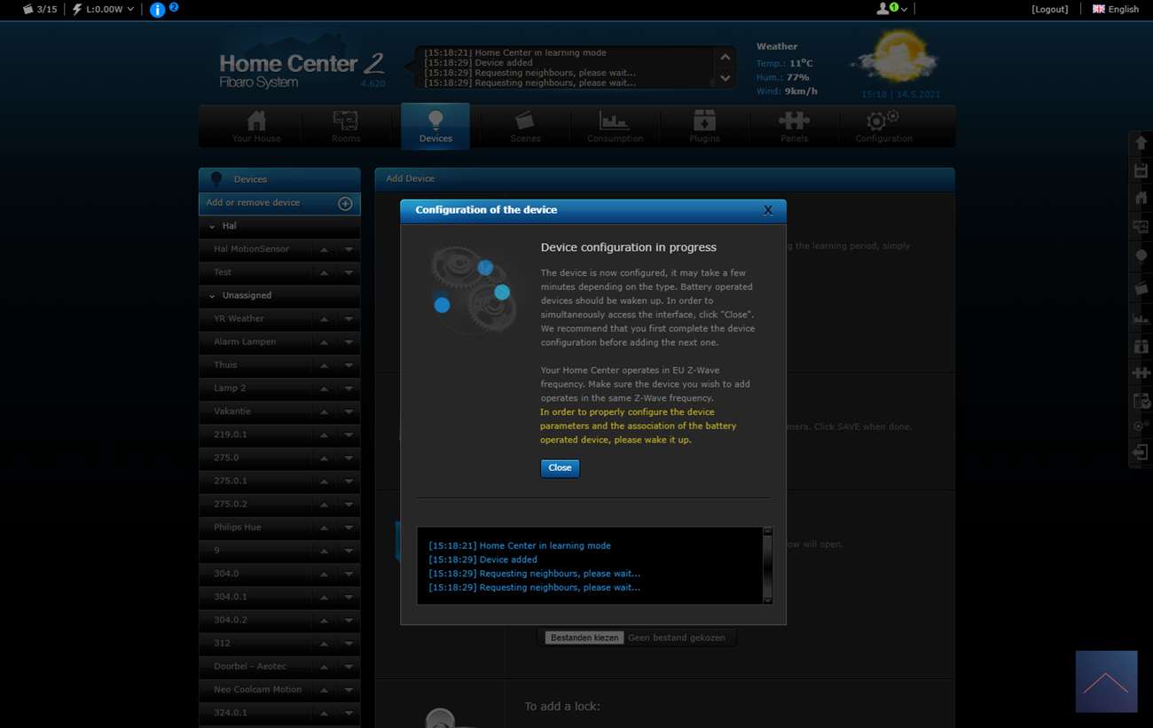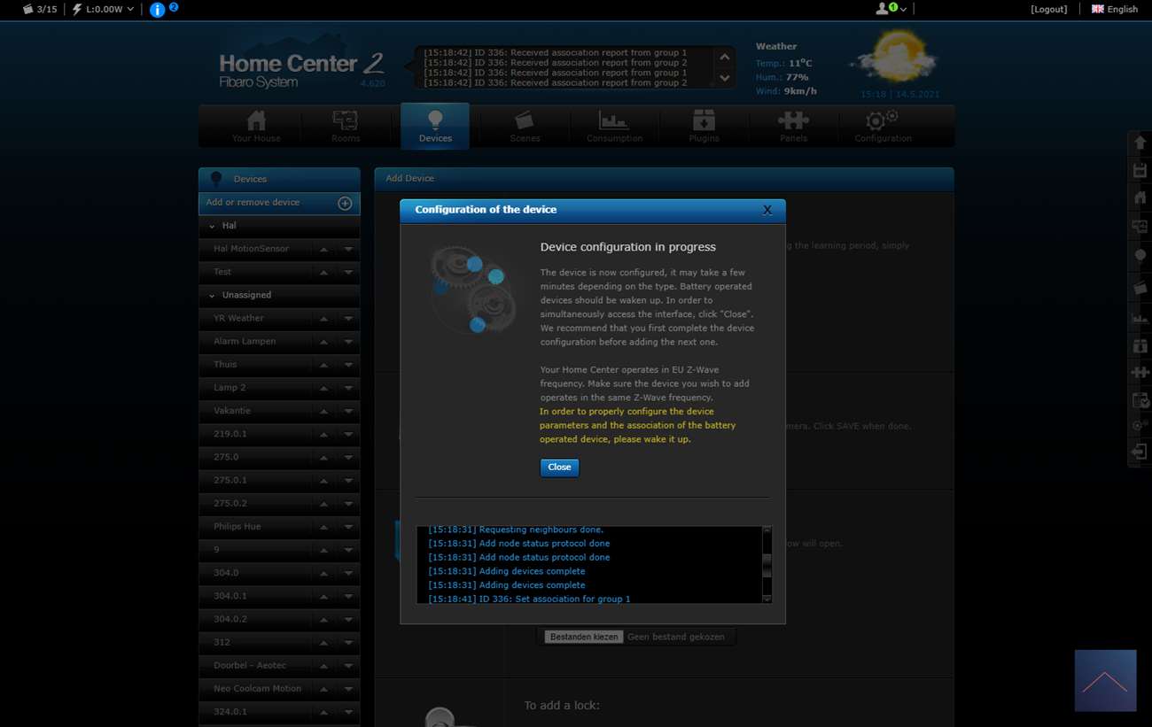 We loggen als eerste in op de web interface van de HC2 en gaan naar onze apparaten. Hierna klikken we op " add/remove device" en hierna op "add". Nu moeten we het lipje verwijderen bij de batterij en het toevoegen knopje 5 seconden ingedrukt houden tot het LED wit wordt. De HC2 geeft een melding dat het toevoegen is gestart en ik zie de LED blauw gaan knipperen op de sensor. Dit geeft aan dat hij aan het "toevoegen" is. Na een paar seconden zie ik hem bij mij apparaten verschijnen.
