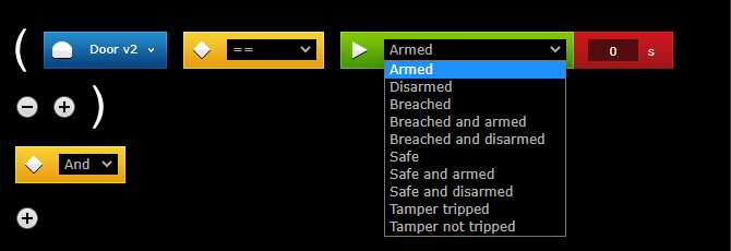 We willen graag dat als het alarm aan staat en de deur wordt open gezet, dat dan alle lampen in de hal aan gaan. We gebruiken hiervoor de trigger "Breached and armed" en zorg dat de "Hal" aangezet wordt.