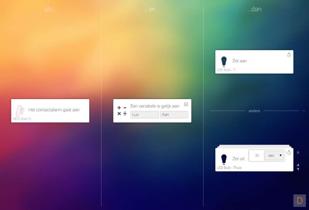 Ik wil graag dat als mijn voordeur wordt geopend dat dan een lamp aangaat en als ik mijn deur weer dicht doe de lamp weer uitgaat na 30 sec. Deze regel mag alleen maar starten als mijn lichtmeter lager dan 20 lux aangeeft. Ik wil namelijk niet dat hij overdag aangaat.