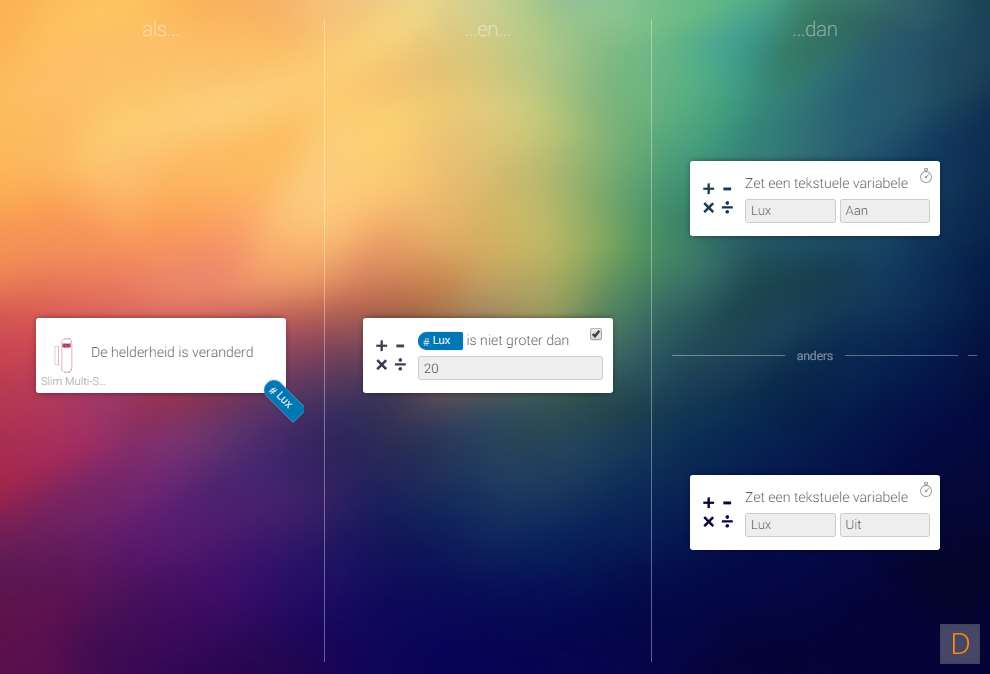 Als eerste maak ik een flow om te bepalen of de lichtmeter een bepaalde sterkte heeft. Ik heb bepaald dat de lamp mag aangaan als de lichtmeter minder dan 20 lux aangeeft. Om in andere regels dit uitgangspunt ook gemakkelijk te kunnen gebruiken zet ik een variabele op "AAN" als ik hem wil gebruiken.