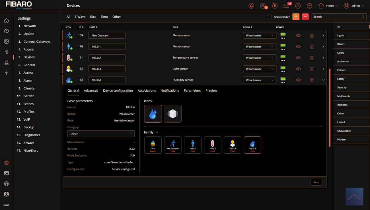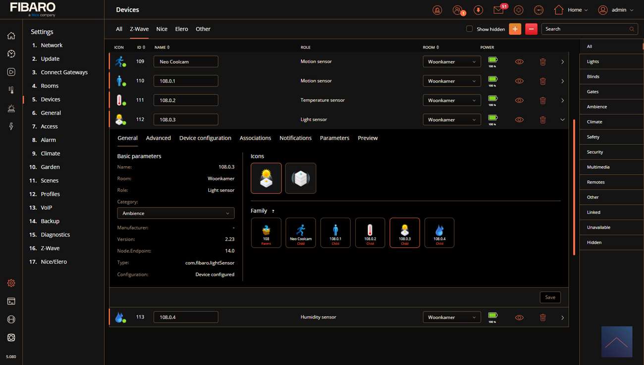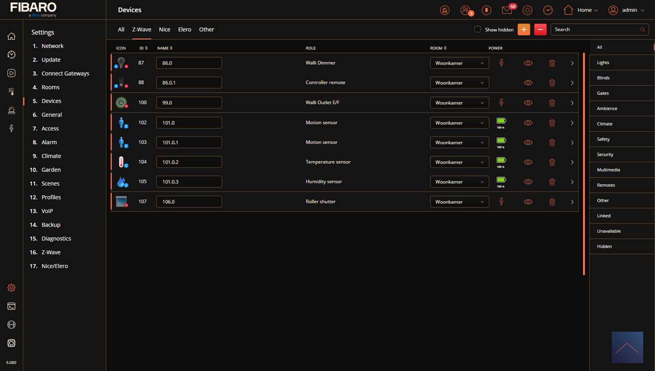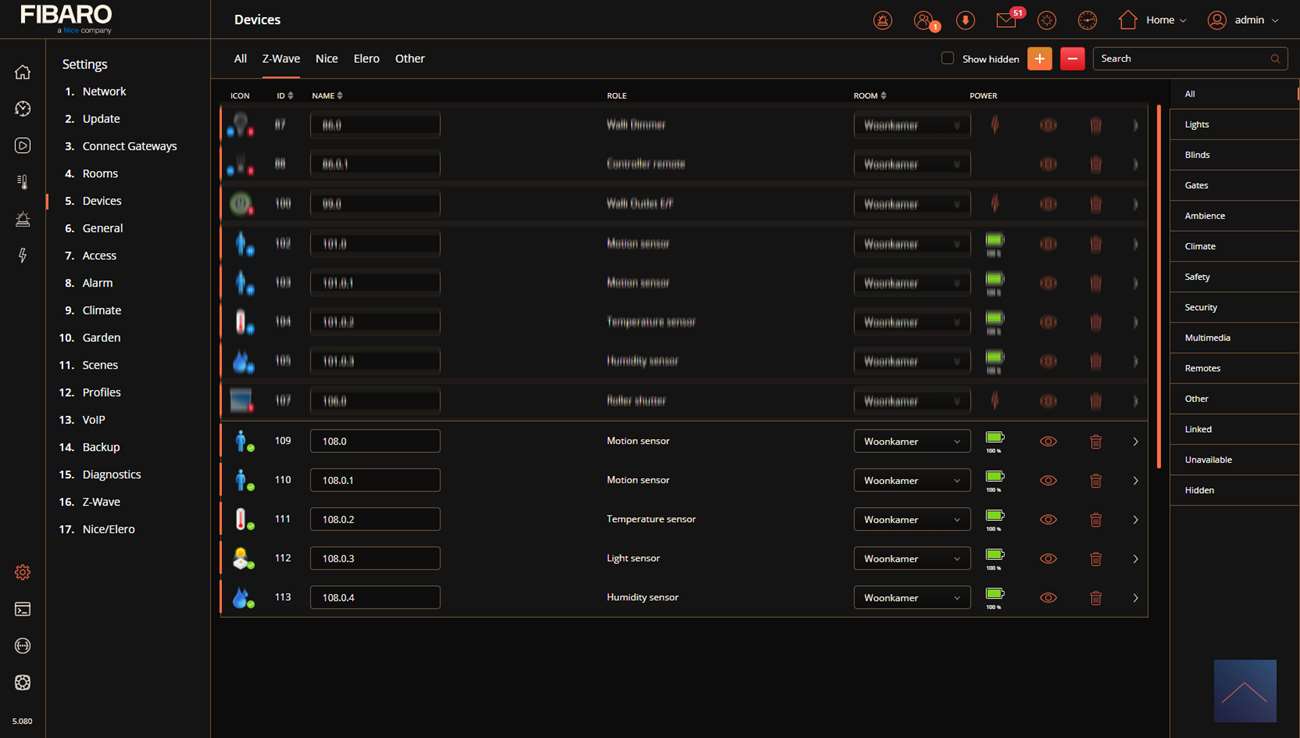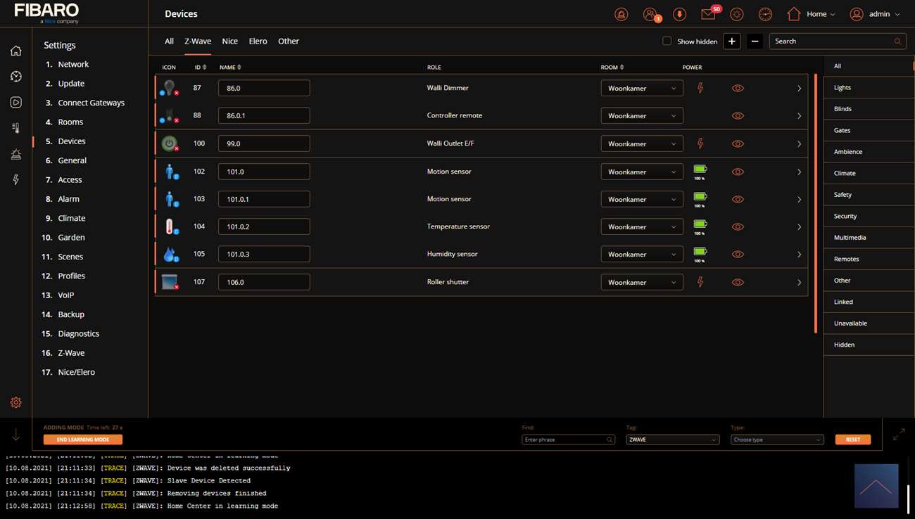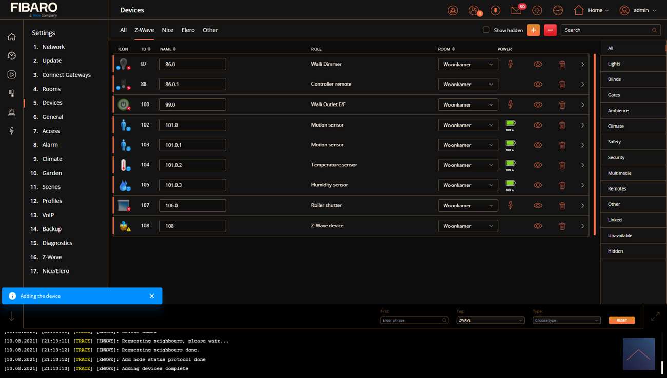 Nu gaat de LED blauw knipperen en vervolgens wordt hij rood. Ik zie dat hij gevonden wordt door de HC3 en zie hem na eentje bij mijn apparaten.
