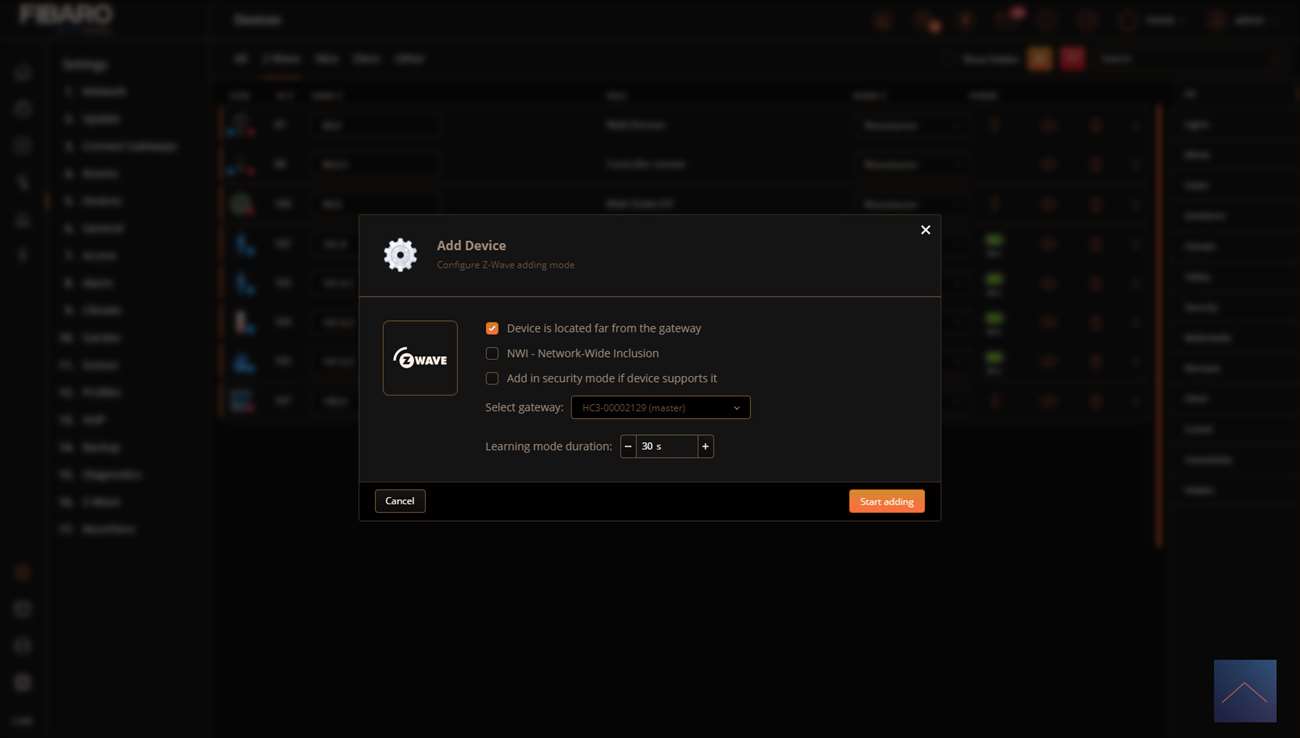 Nu klikken we op het plus en selecteren Z-wave. We drukken we het knopje van de sensor net zolang in tot de LED wit wordt. We laten vervolgens het knopje weer los. Wacht niet tot de LED weer helemaal uit is want dan zal het toevoegen niet lukken.
