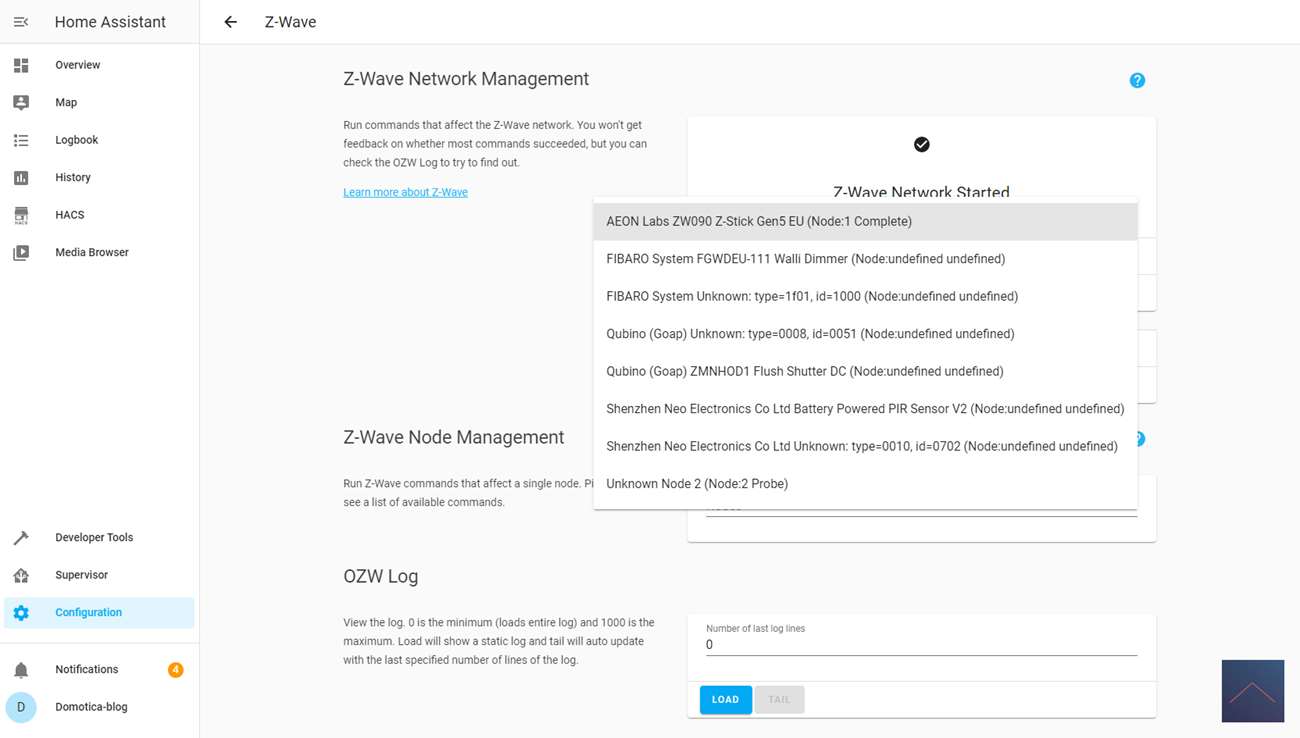 Als laatste controller is HASS aan de beurt. Dit is een gratis software pakket welke je op verschillende hardware kunt installeren. Wij hebben hem draaien op een RPI-3 met een Aeon Labs Z-Wave USB stick om hem toe te voegen. Je kunt het toevoegen starten door naar de configuratie te gaan en hierna op Z-Wave te klikken. Vervolgens klik je op "add node secure" om het toevoegen te starten. HASS geeft een zeer korte melding dat het toevoegen is gestart.