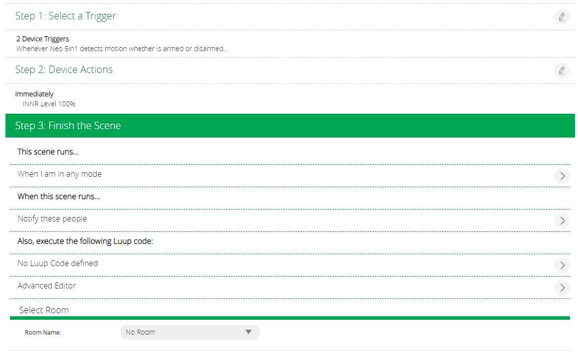 We maken een scene waarbij als er beweging wordt gedetecteerd en de lux waarde lager is dan 5 de lamp in de hal aangezet wordt.