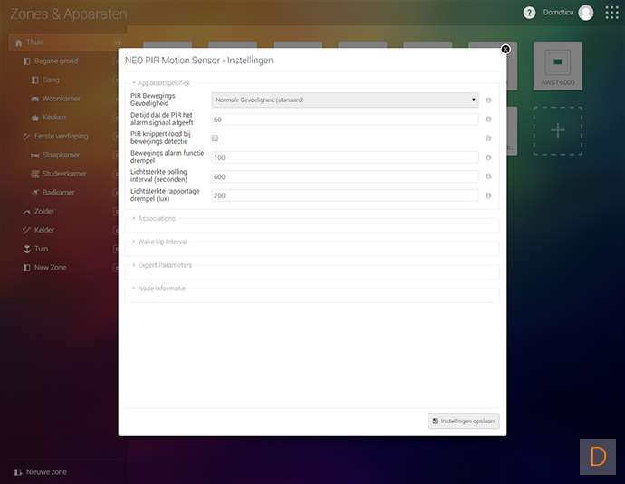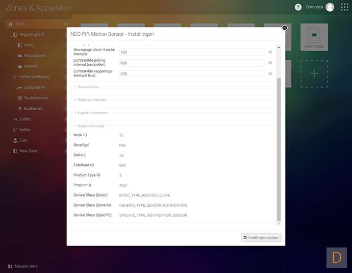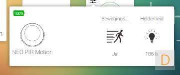 Hierna werd hij gevonden en geïnstalleerd. Je krijgt een bewegings- en lichtsensor te zien op het apparatenscherm. Via de configuratie zijn de parameters te beheren. Dit scheelt weer zoeken in de handleiding.