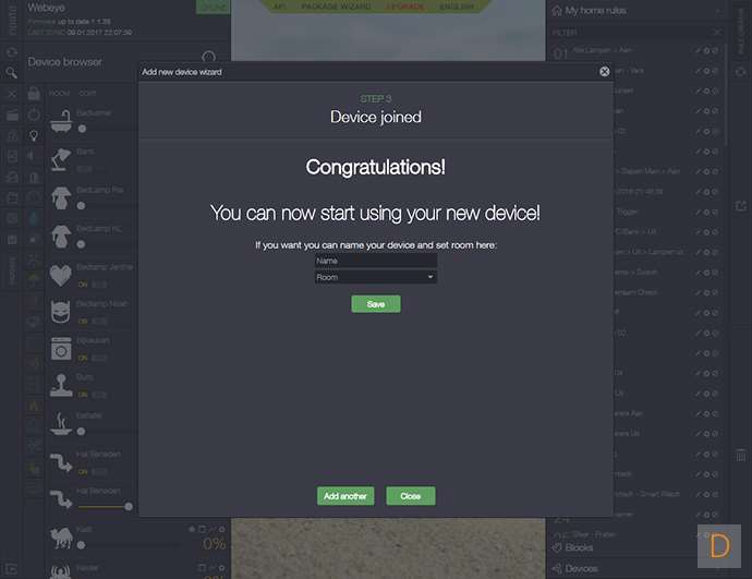 Als hij succesvol is toegevoegd zie je op het dashboard de bewegingsmelder en de lux waarde.