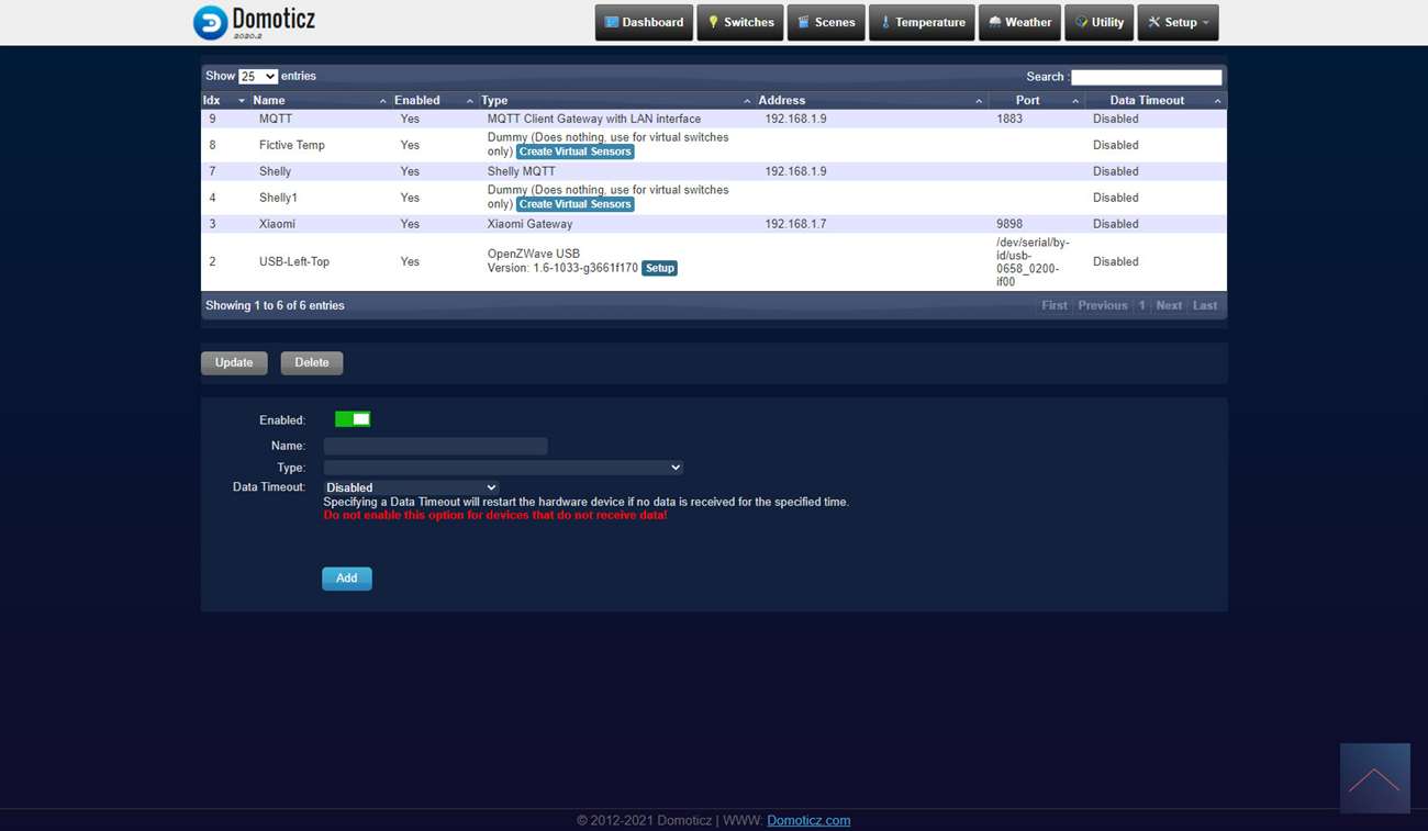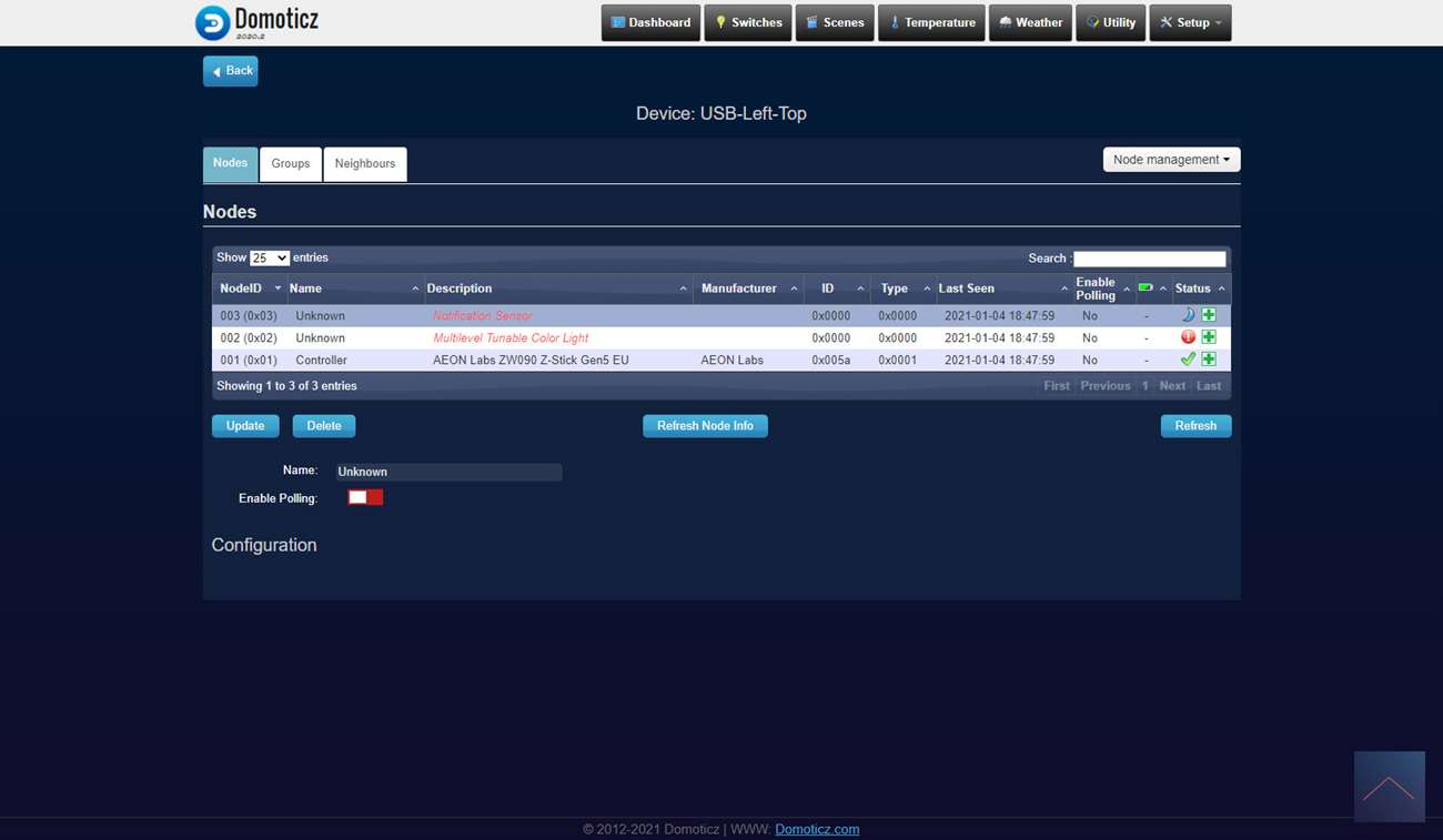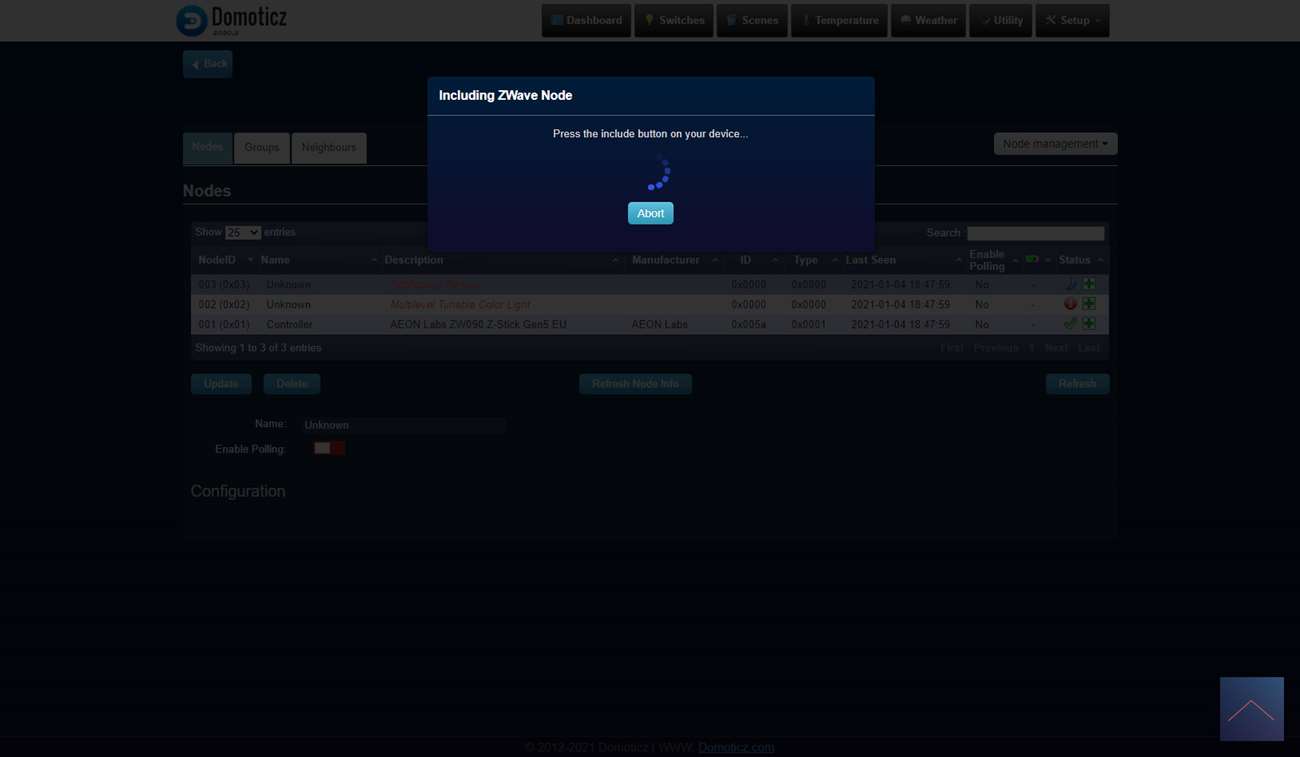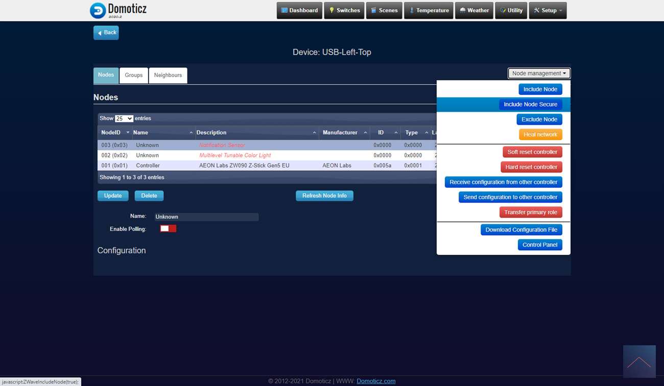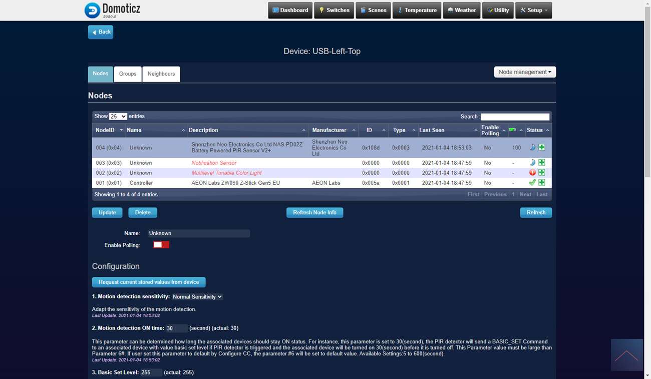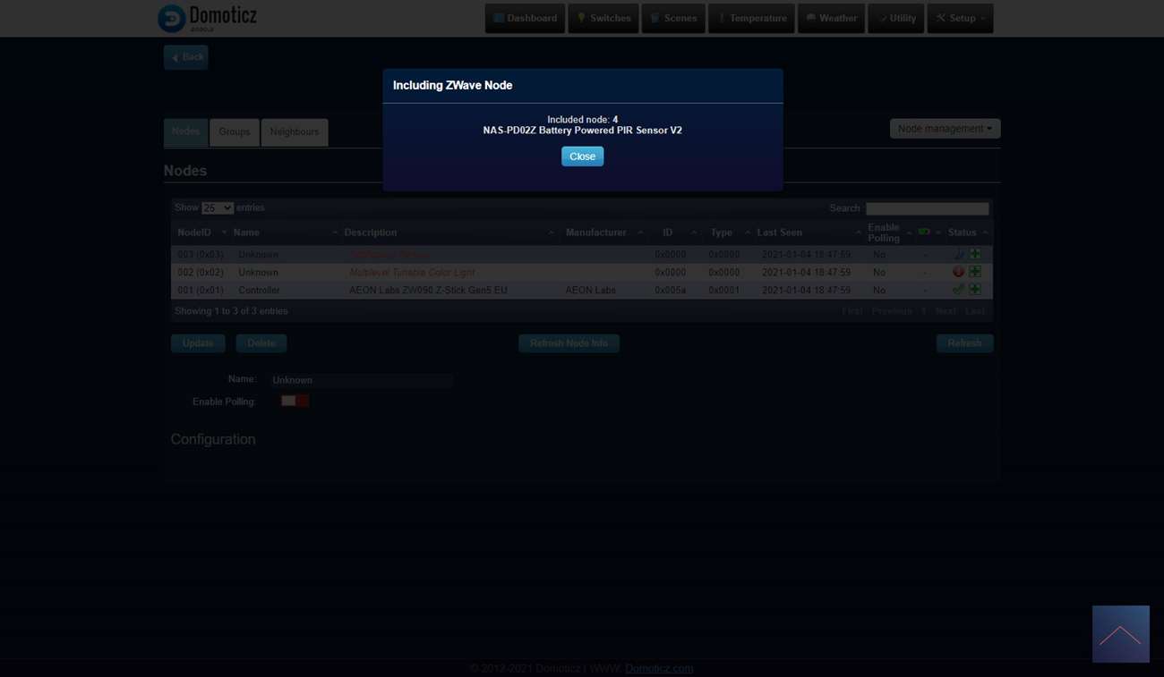De een na laatste controller waarmee we deze sensor gaan testen is Domoticz met de Aeon Labs USB Z-Wave stick. Ben benieuwd of hij met deze goed gaat werken. We loggen in en gaan naar het menu "Setup" en dan "Hardware". Vervolgens klik ik op "Setup" bij de stick en klik ik rechts op "include node". Hierna verwijder de kant van de sensor en het lipje bij de batterij. Om het toevoegen te starten drukken we 3x snel achter elkaar op het knopje boven de batterij. De LED zal 5 keer gaan knipperen om aan te geven dat het toevoegen is gelukt.