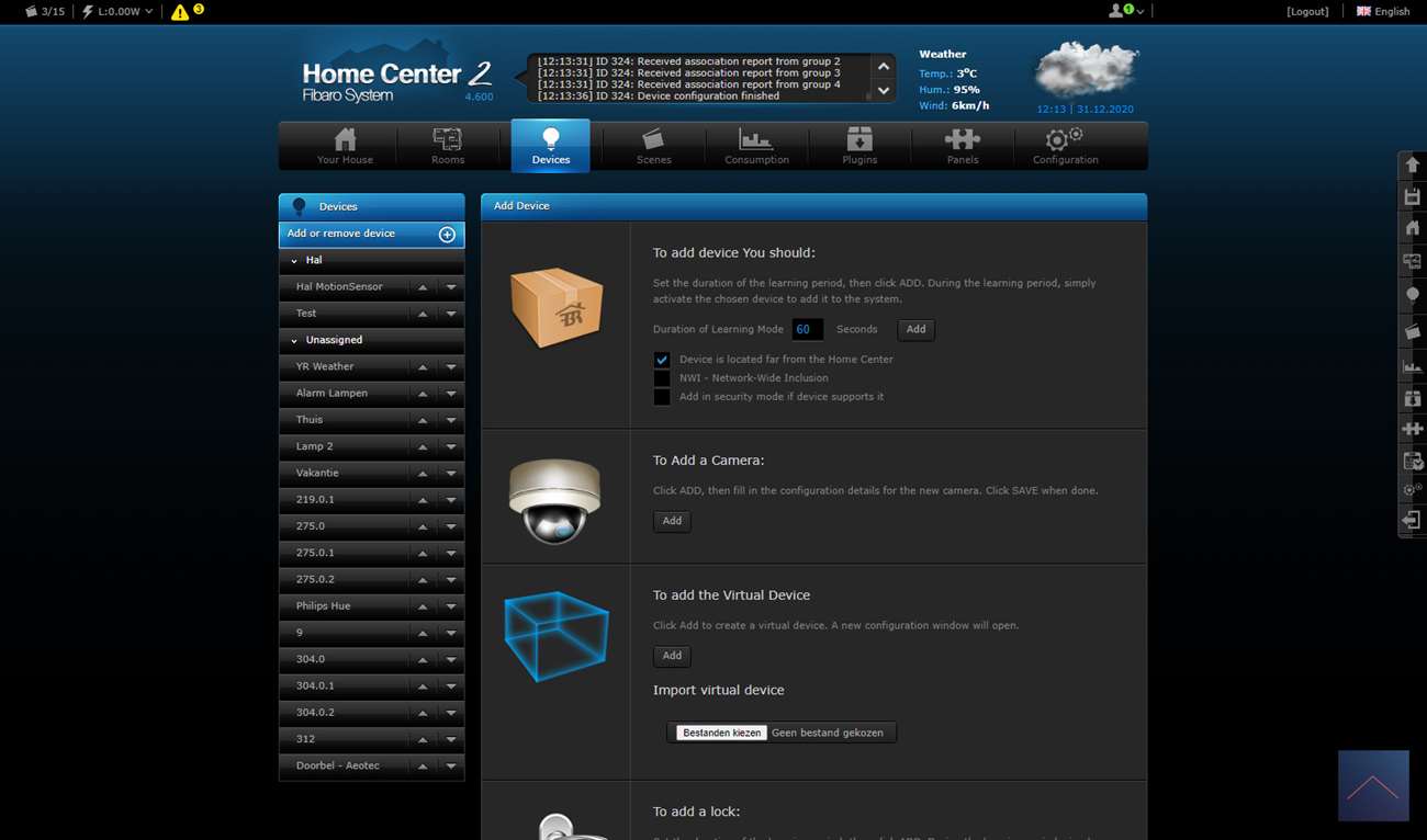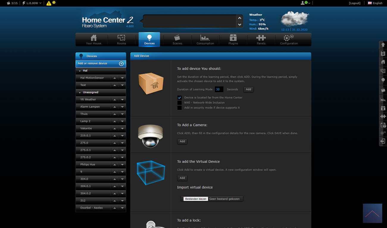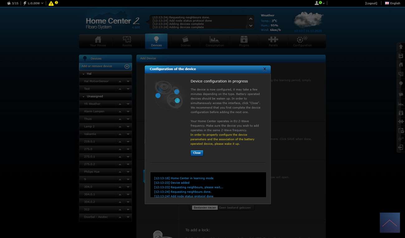 De volgende controller is de HC2 van Fibaro. Het toevoegen gaat weer door de controller in de "toevoegen" stand te zetten en de motion sensor weer van stroom te voorzien. Dit kun je doen door in te loggen en naar je apparaten te gaan en vervolgens te klikken op "add and remove device". Vink vervolgens "add node secure" aan en druk op "add".