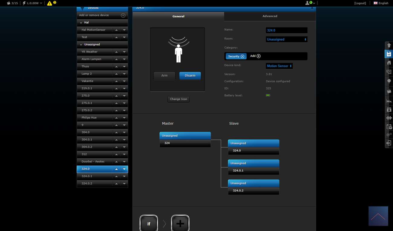Haal nu het lipje weg bij de batterij weg en druk 3x op het knopje aan de binnenkant. Hierna werd hij toegevoegd aan de HC2. Ik krijg een melding dat er nog geen template beschikbaar is. Ondanks dit, zie ik netjes op het dashboard de bewegingen, lichtsterkte en de temperatuur.