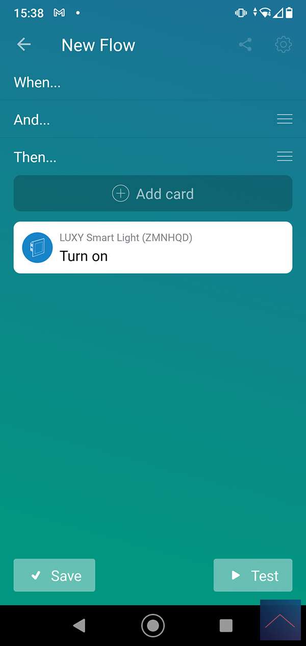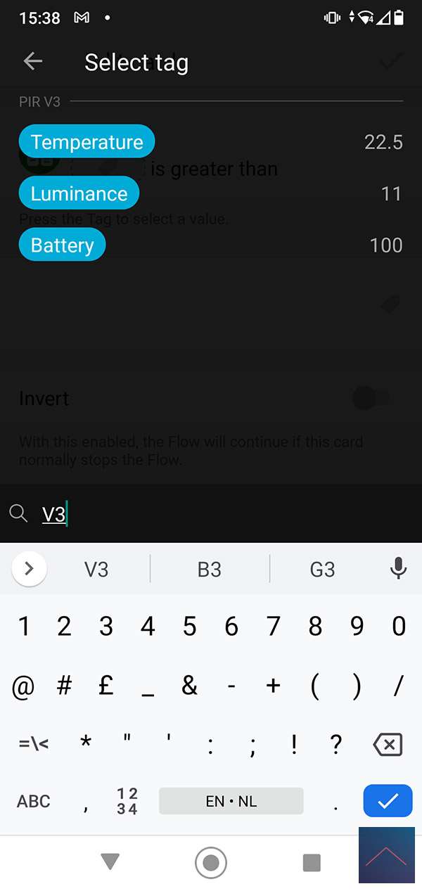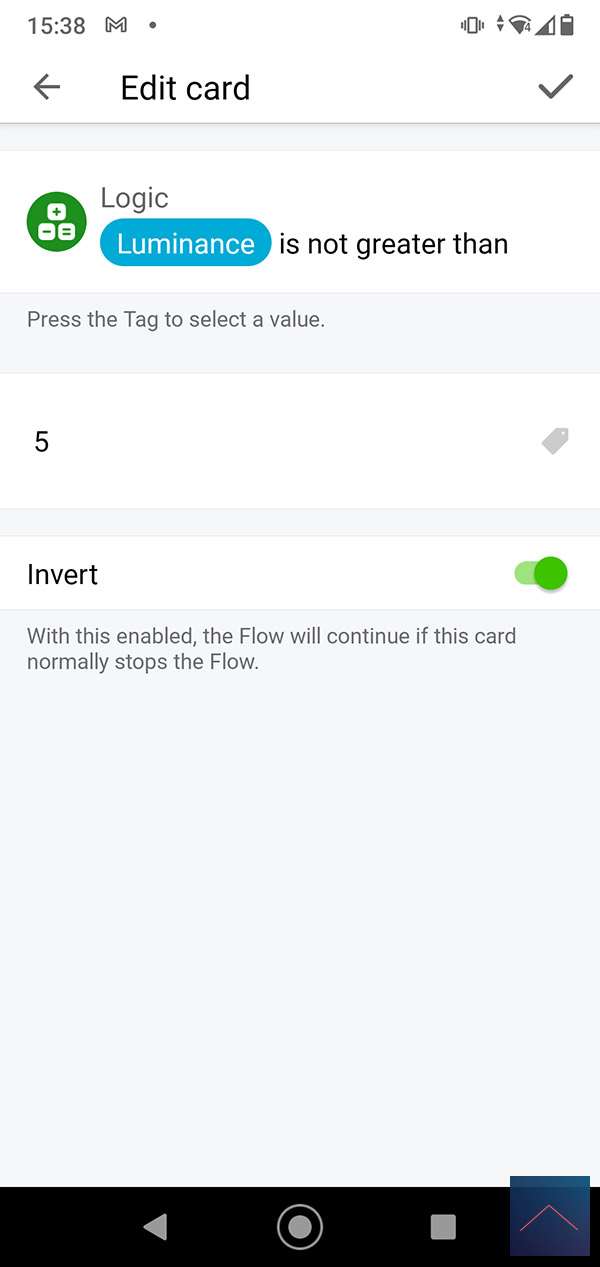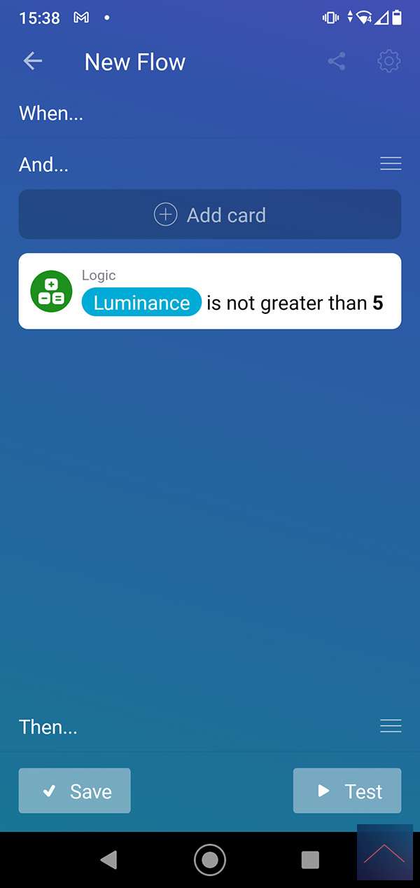 We maken een flow waarbij we de ingebouwde luxsensor gaan gebruiken. We zorgen dat als er beweging is en de lux-waarde lager is dan 5, dat dan een lamp wordt aangezet.