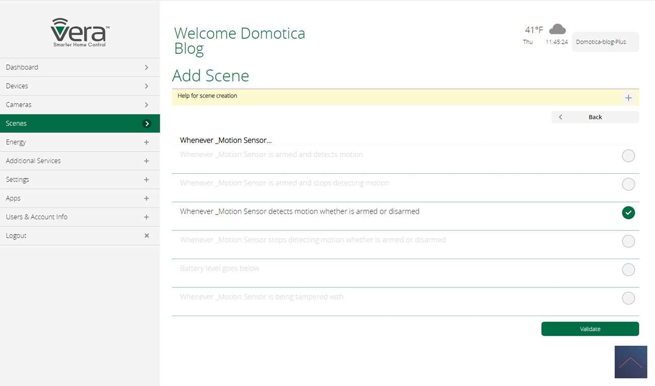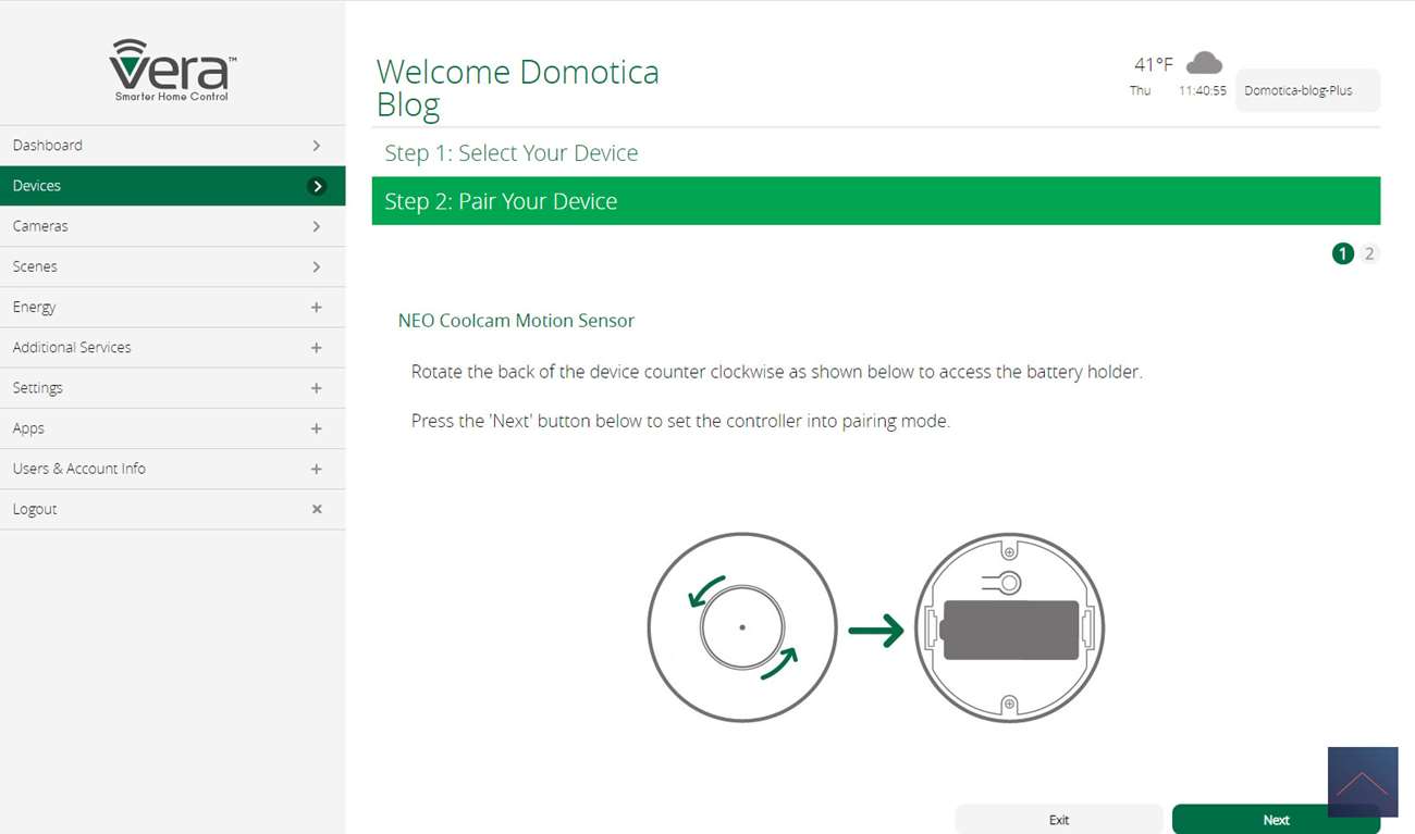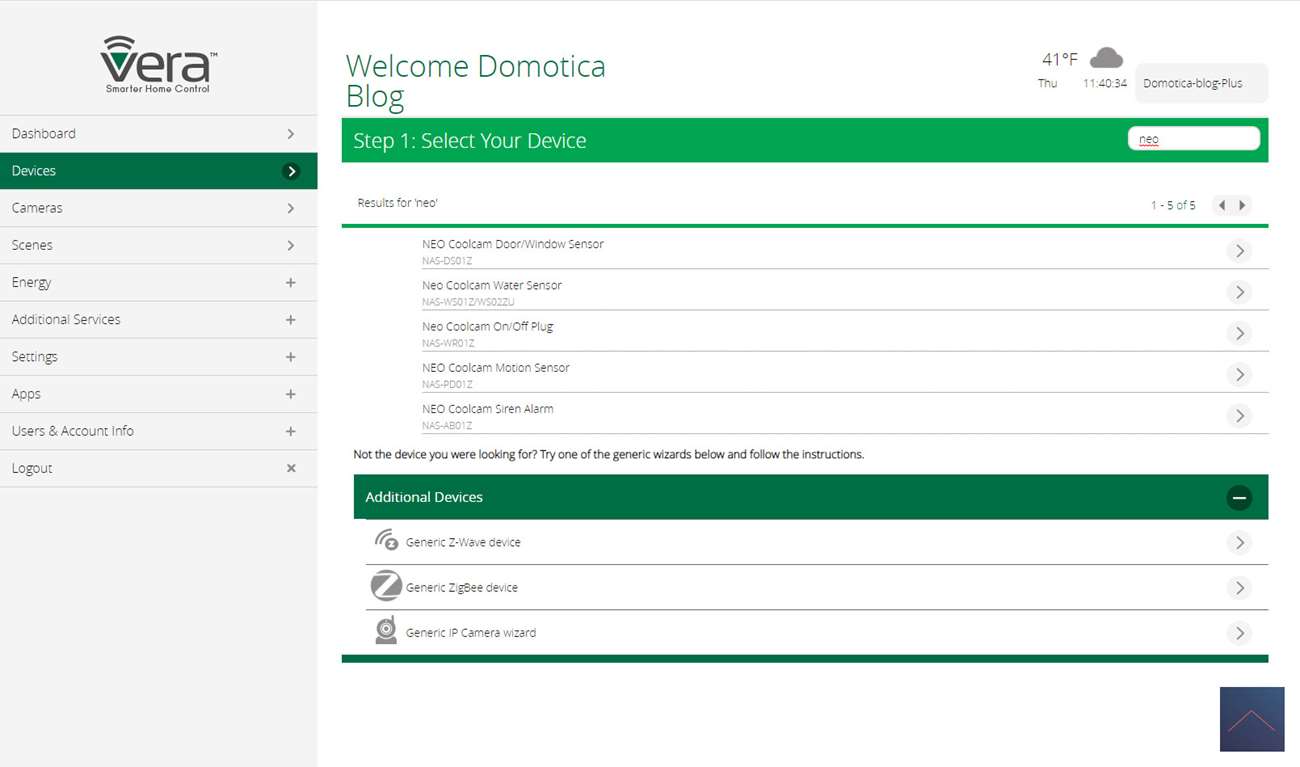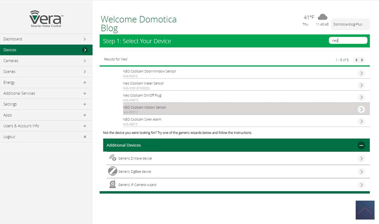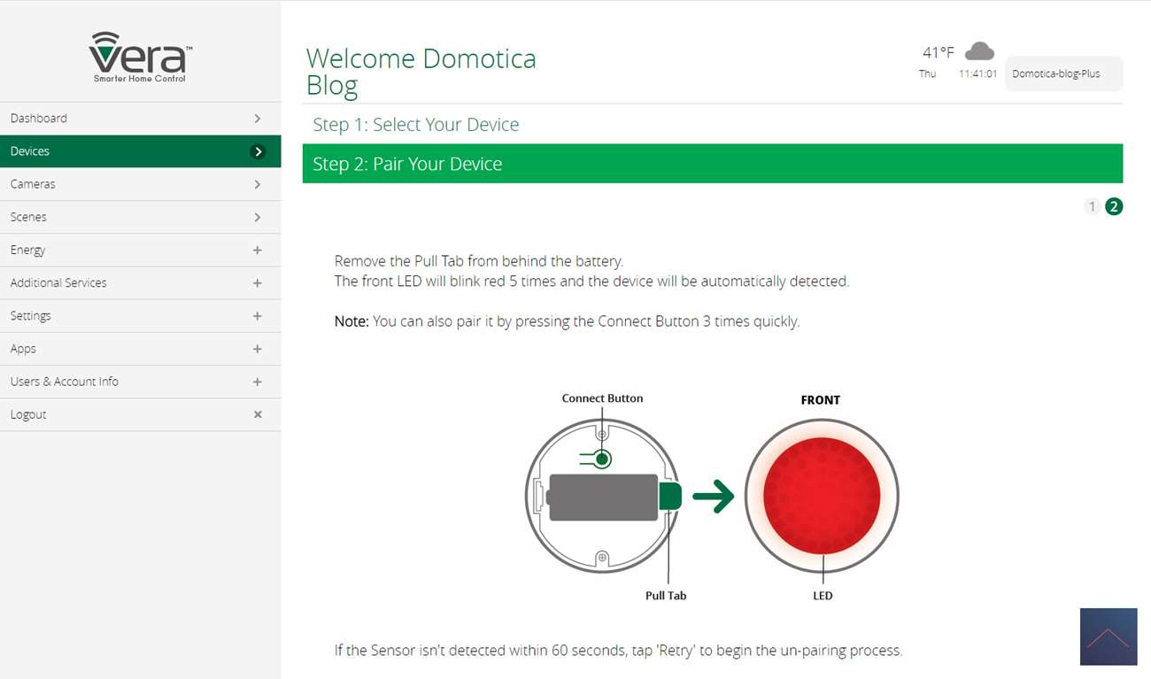 We gaan deze sensor ook installeren op de Vera. Je kan het toevoegen starten door in te loggen en naar de "devices" te gaan. Vervolgens klik je op "add device" en zoek je de sensor op. Ik zie de sensor in de lijst staan en klik deze aan. Na wat stappen zal de controller in leermodus gaan. Je moet nu de achterkant van de sensor los maken en het lipje bij de batterij weg halen. Om het toevoegen te starten druk ik 3x snel achter elkaar op het knopje boven de batterij.