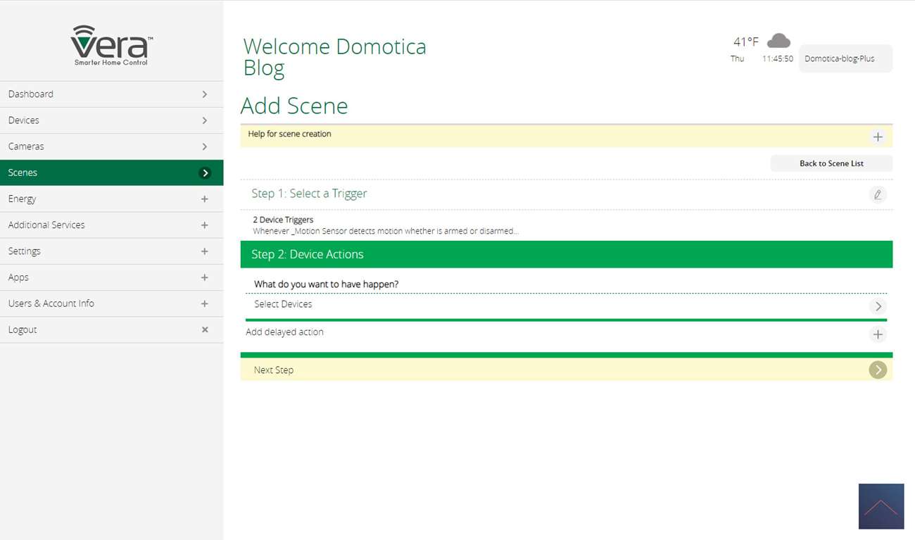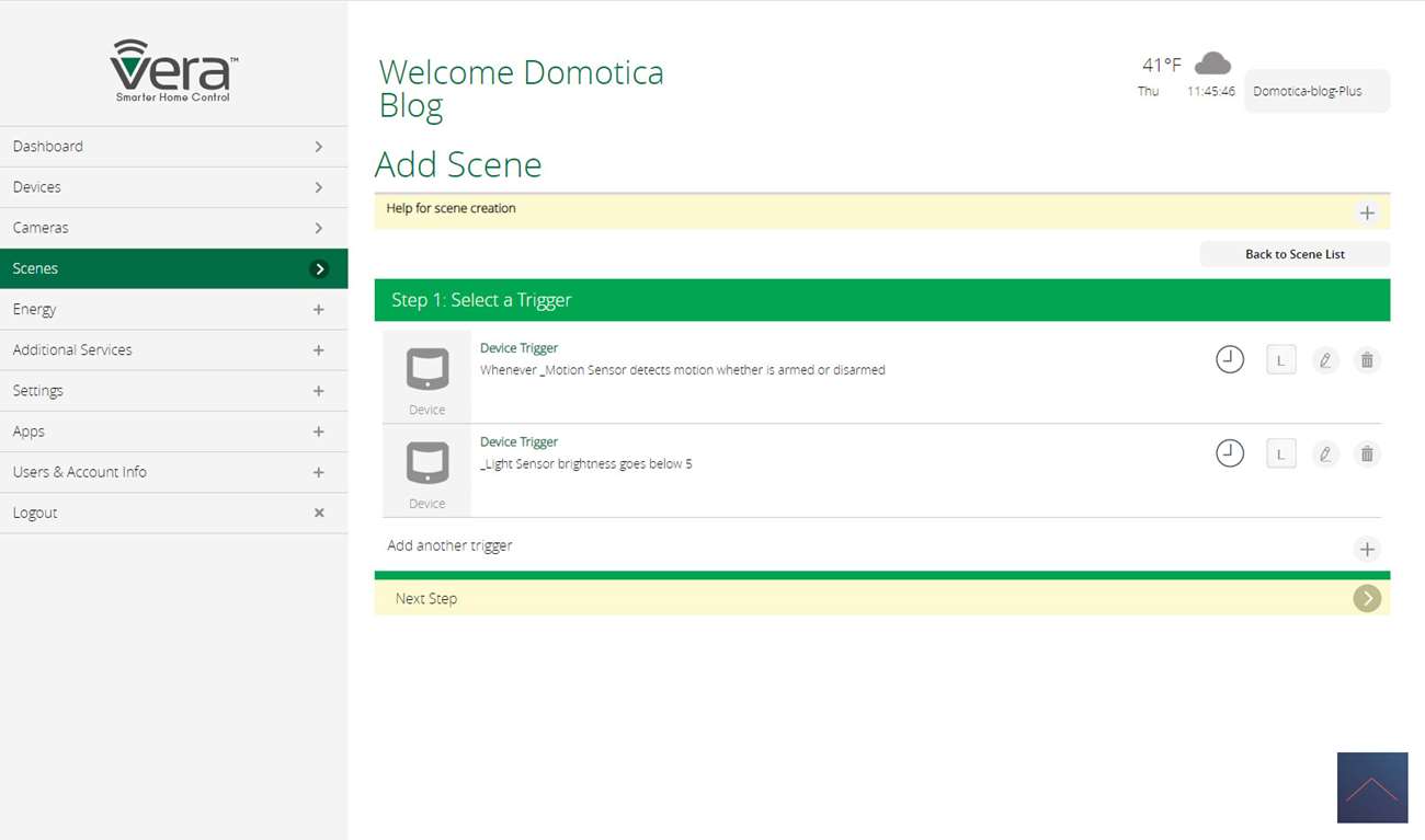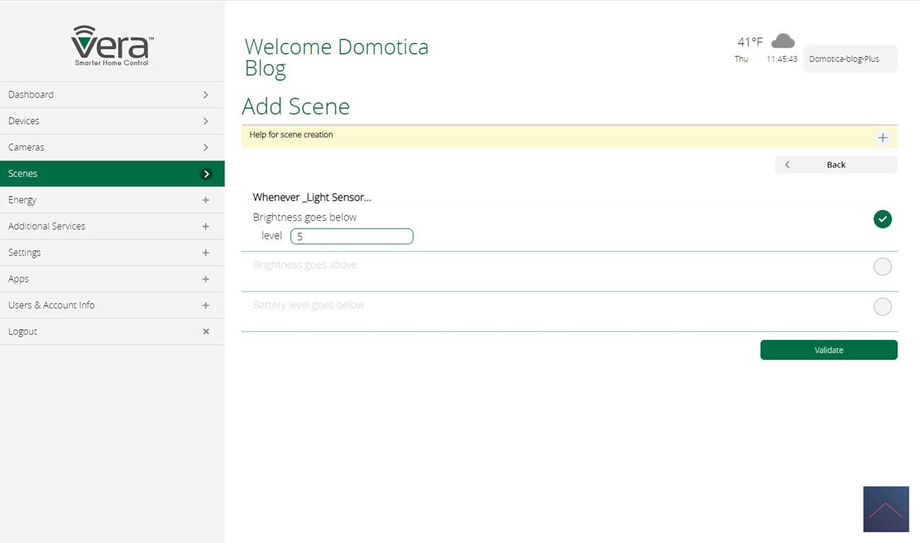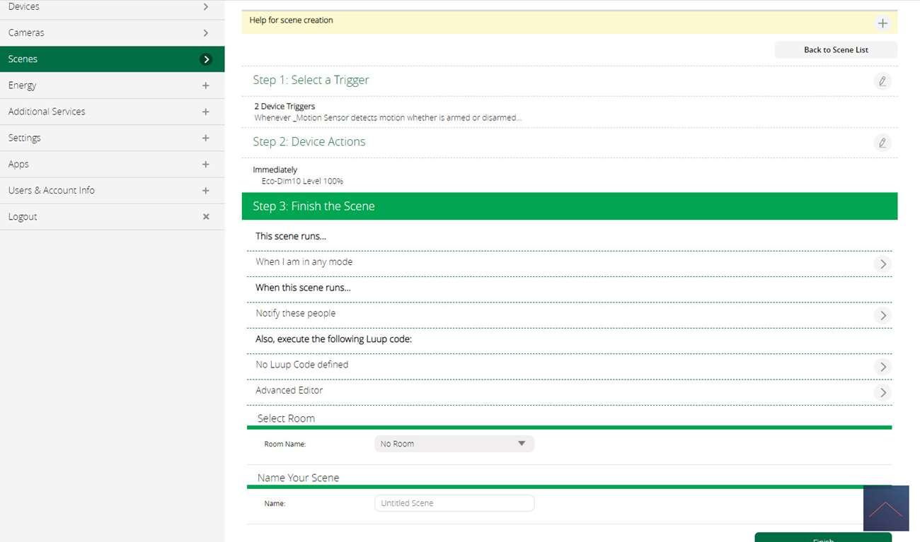We maken als scene: als er beweging is, en de lux-waarde is lager dan 5, dat dan de lamp aangezet mag worden.
